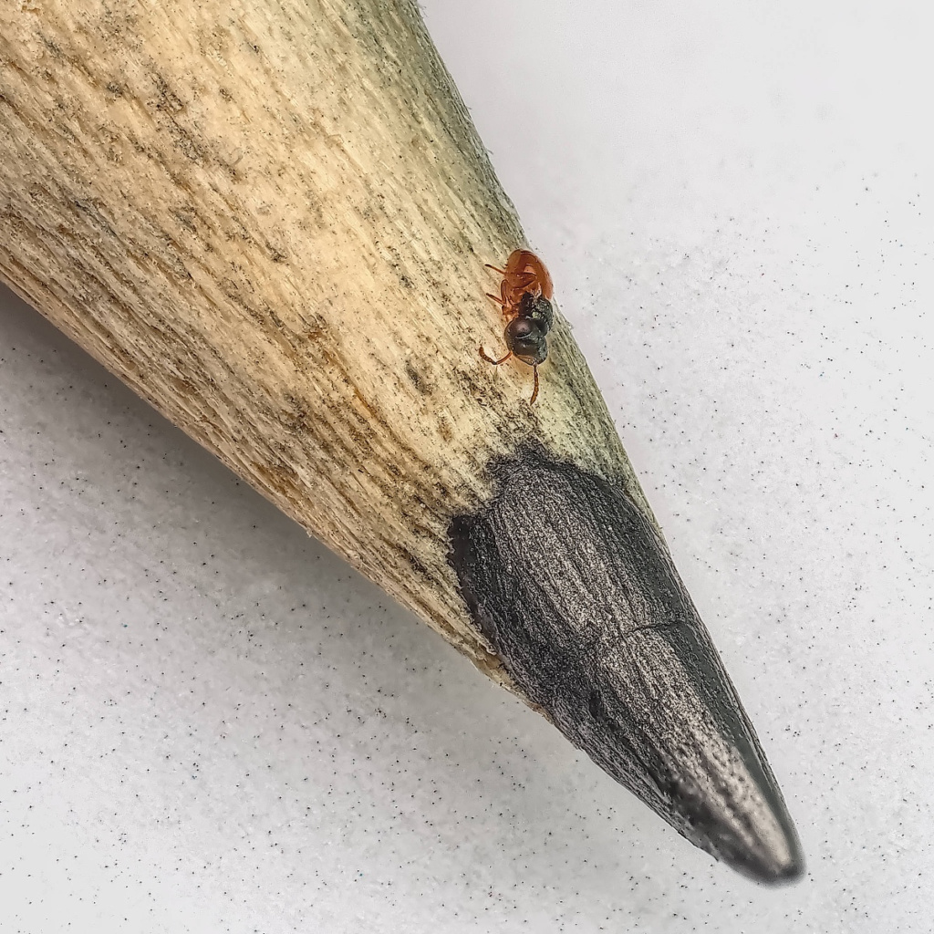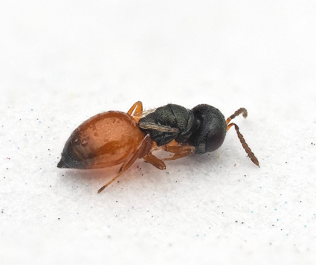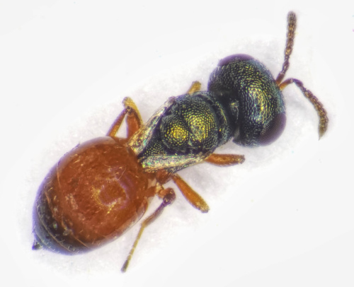 Callitula pyrrhogaster is a tiny, flightless parasitic wasp. Wings rudimentary, head in dorsal view only 1.8 to 1.85 times as broad as long. Abdomen (gaster) dorsally with the basal half or more reddish-orange.