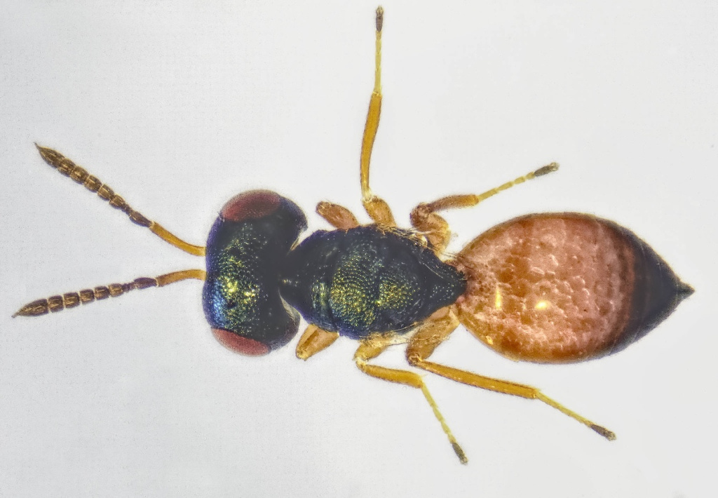 A tiny parasitoid wasp of flies. A known parasitoid of the frit fly (Oscinella frit), considered a pest of agricultural crops like oats, barley, wheat, and maize.