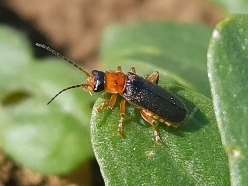 Length: 5-7mm. The head and elytra are grey-black but the pronotum is orange, sometimes with small dark marks, and is square-shaped. The legs are usually all yellow/orange except the black rear tibiae. Outer edge of elytra yellow.