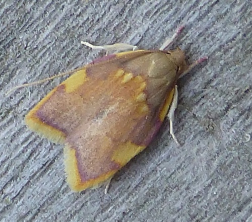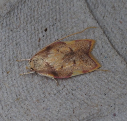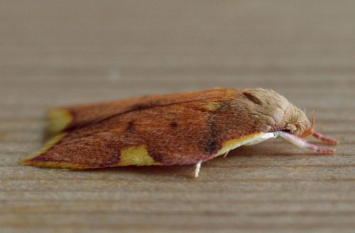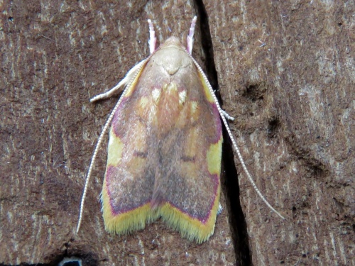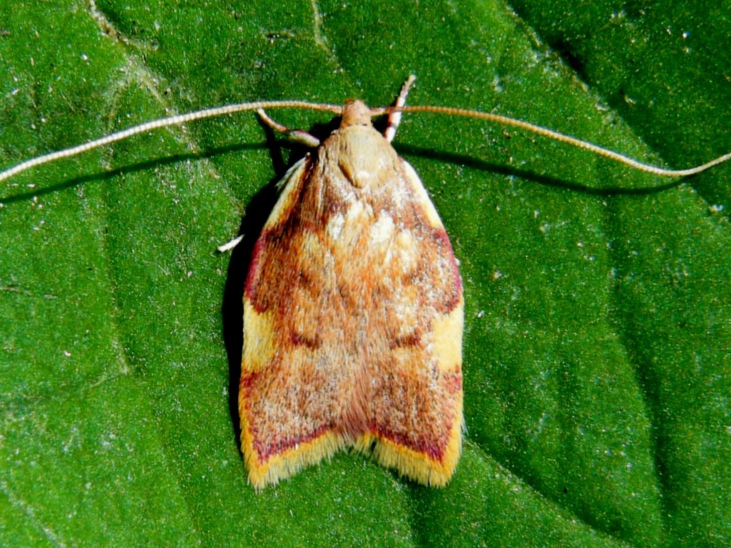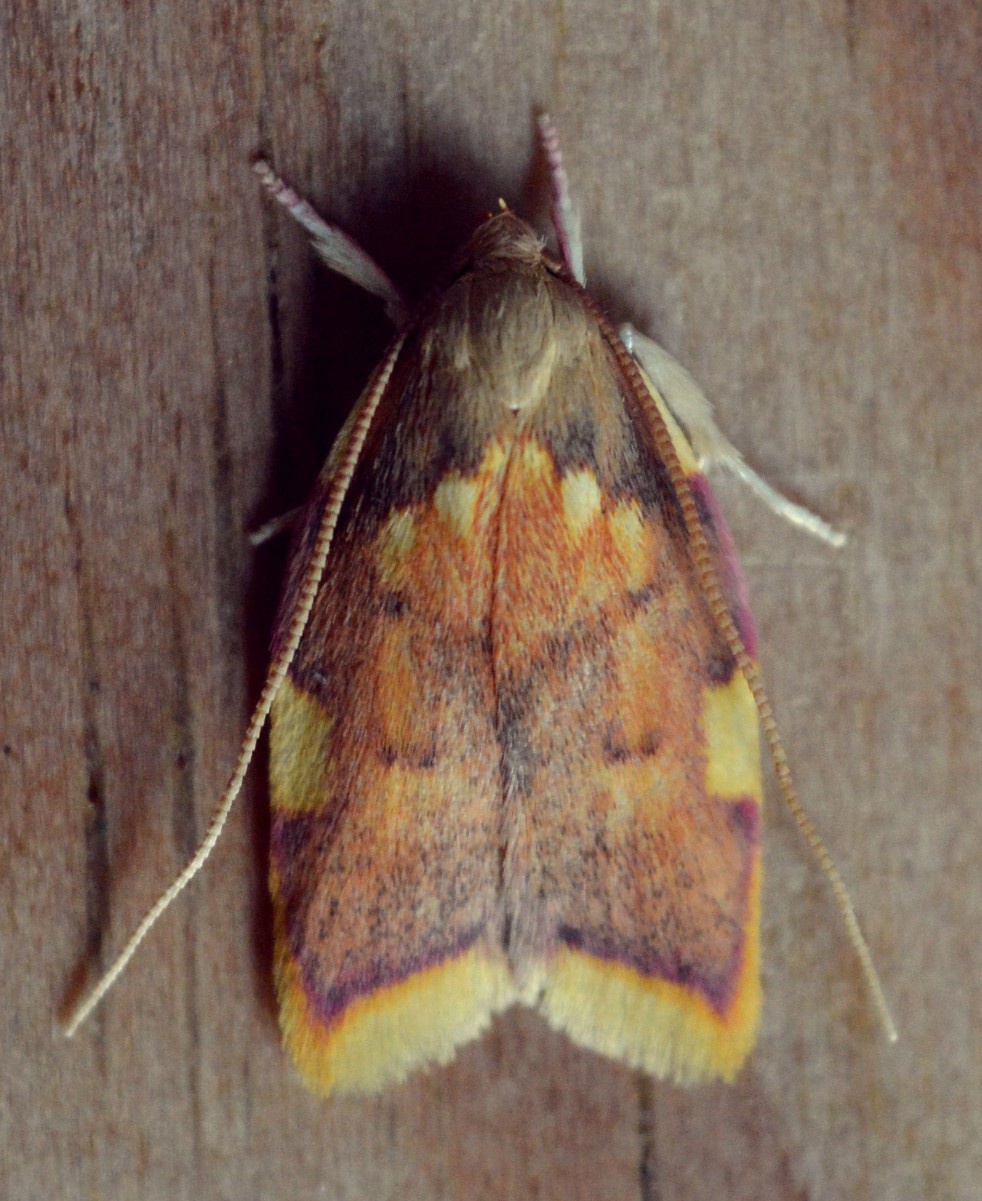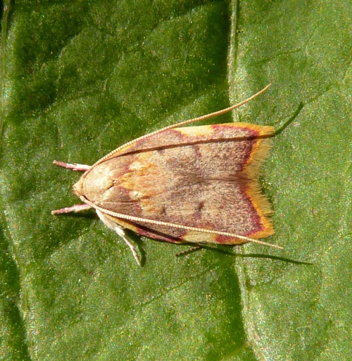 Wingspan 16-22 mm. A smallish but brightly coloured moth with noticeably long antennae.