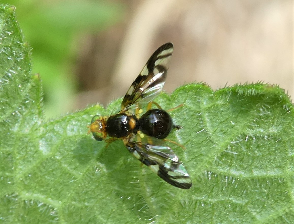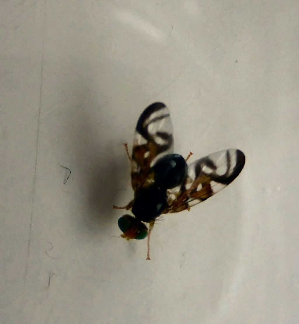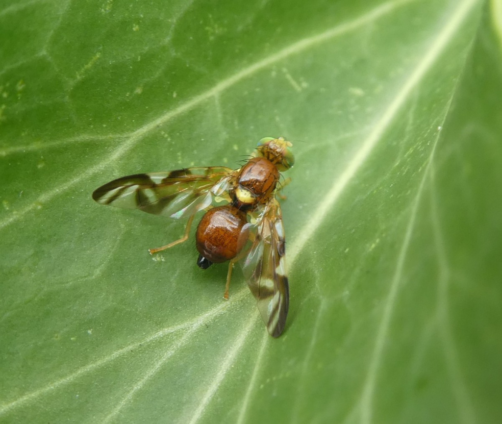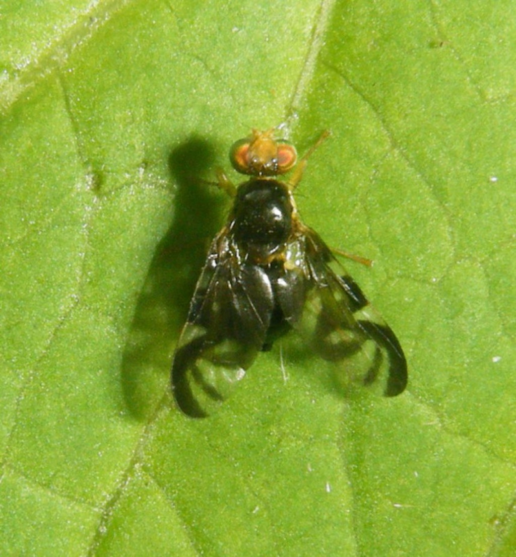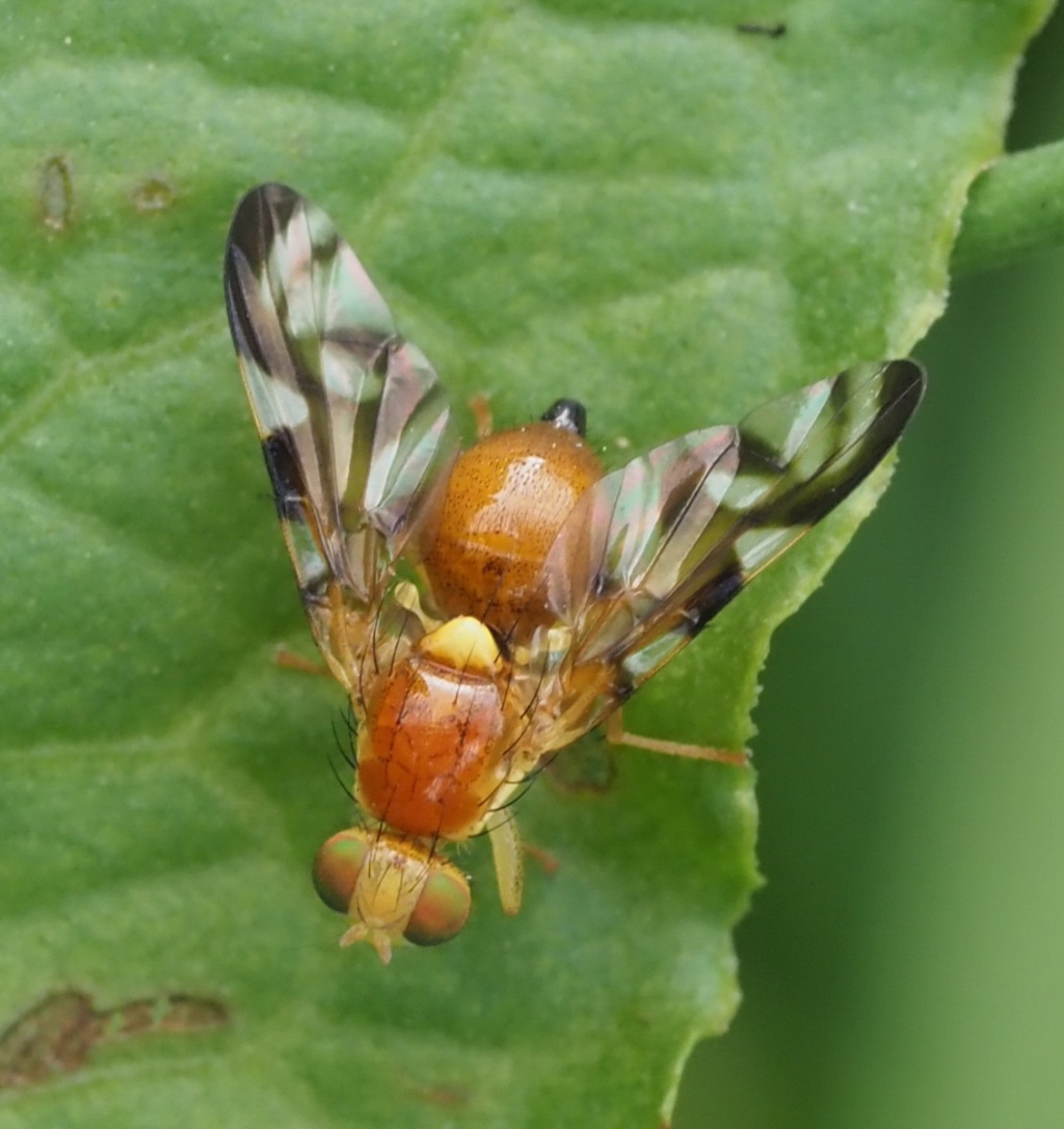 This is a small picture wing fruit fly which has very heavily marked with brown patterning. It has green eyes.