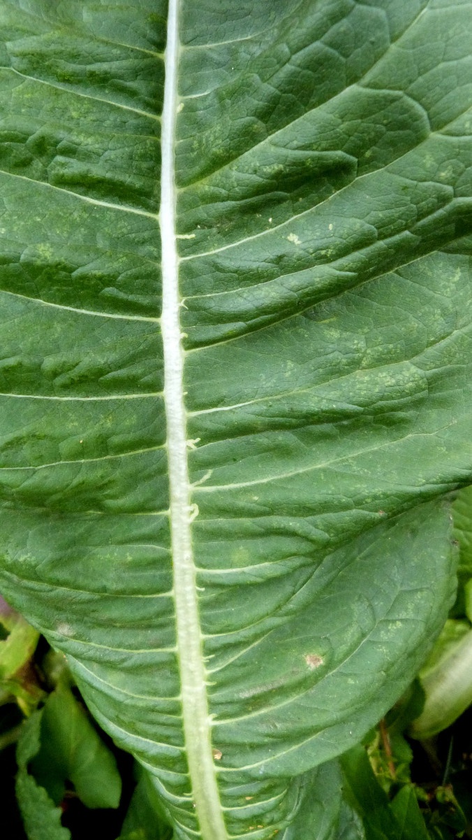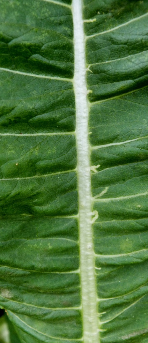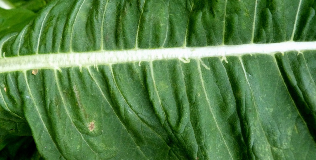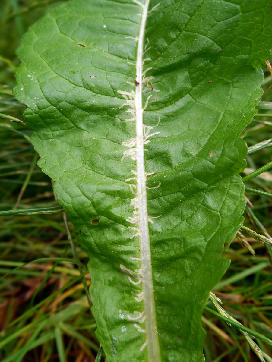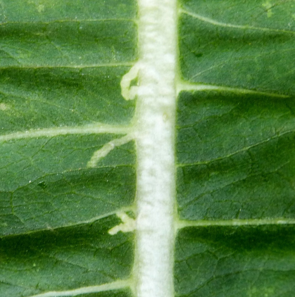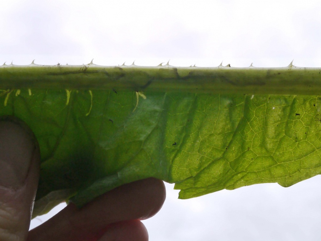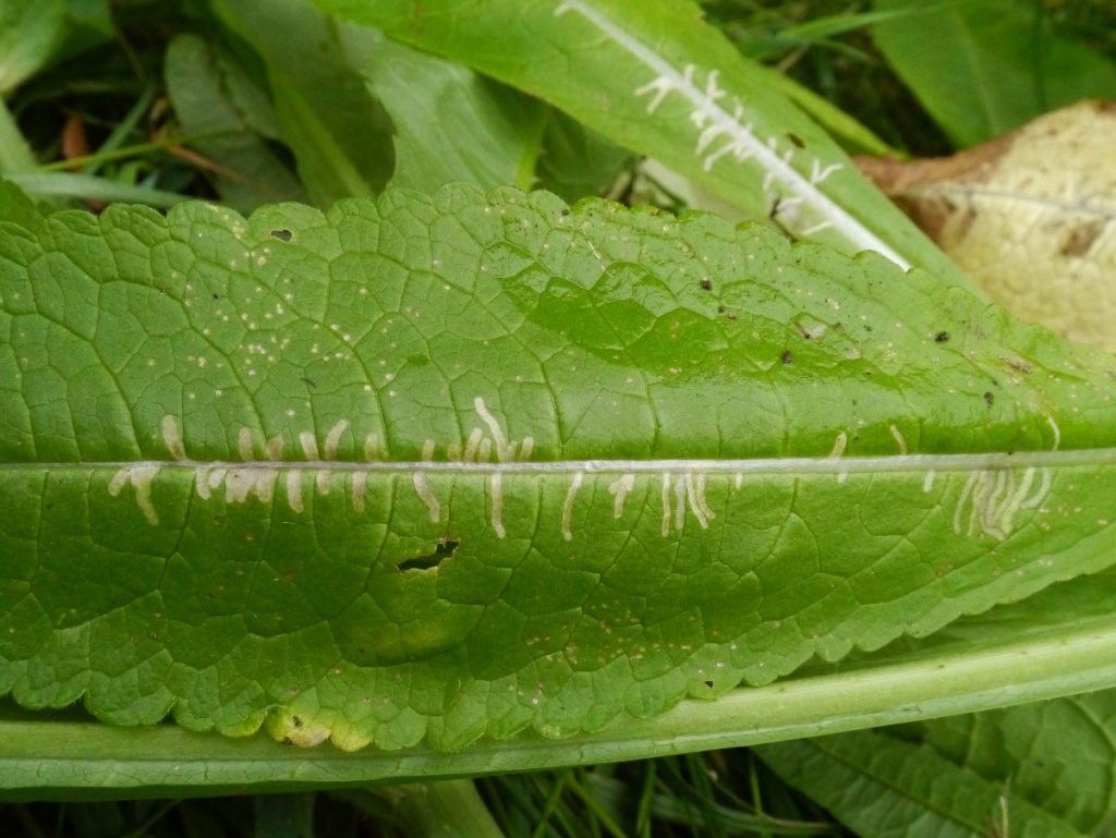 The larvae of the fly Chromatomyia ramosa mine the leaves of Teasel and Scabious species. They feed along the midrib but make short, narrow corridors into the leaf.