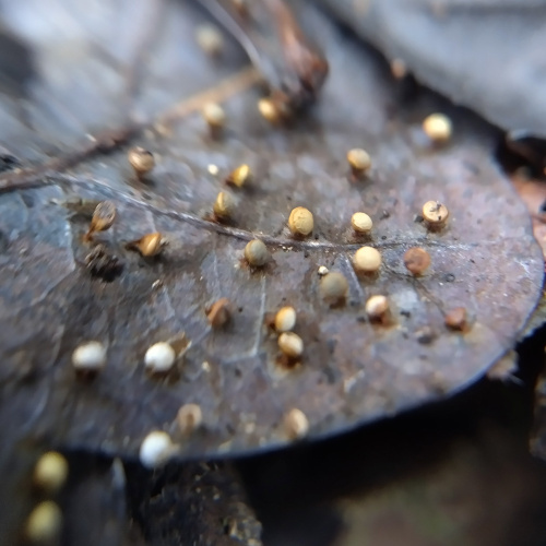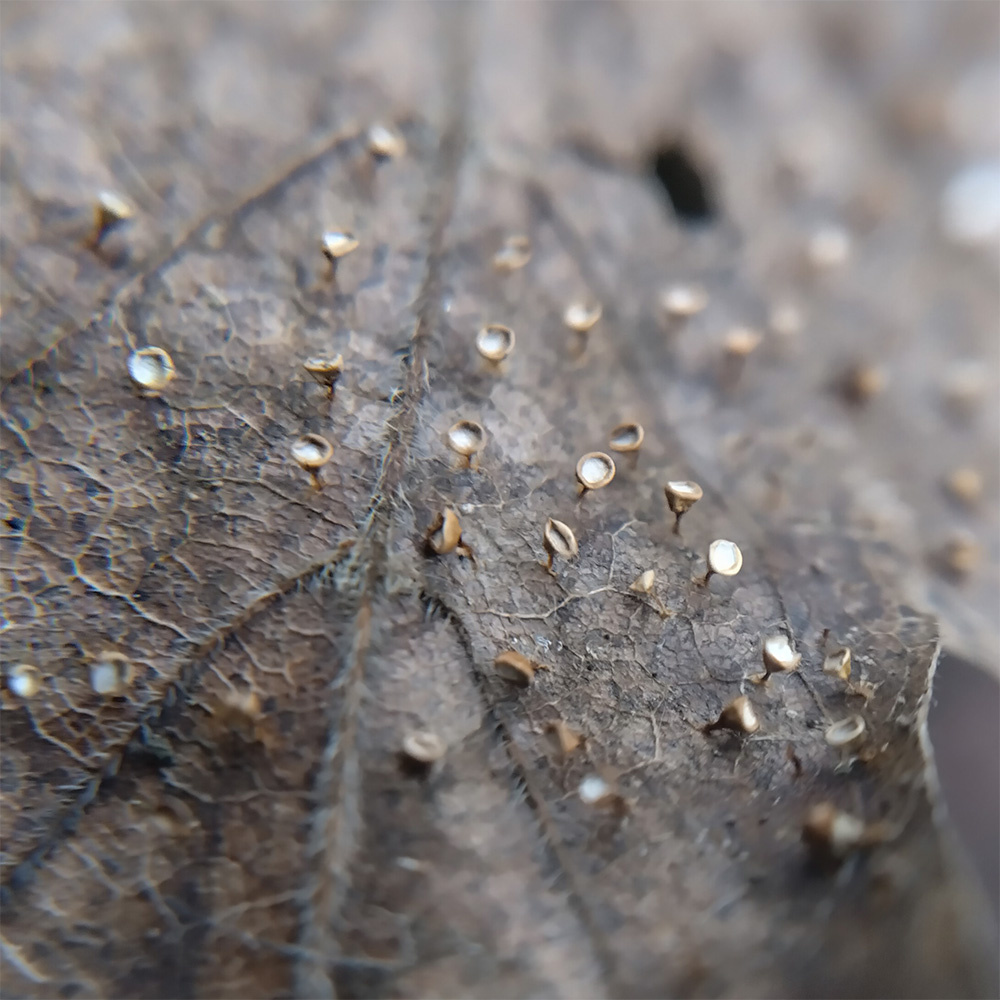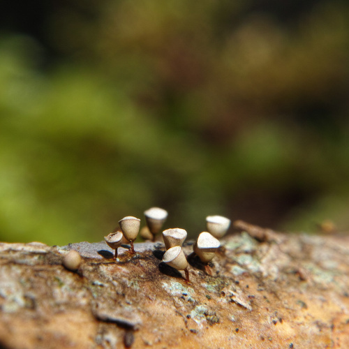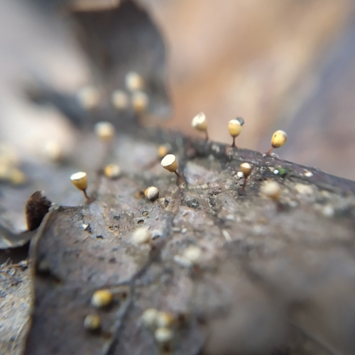 The slime mould Craterium minutum reaches an overall height of 0.7 to 1.5 mm. It is goblet-shaped or funnel-shaped, stalked, erect and with a ‘lid’. The colour may be yellow, orange-brown, pale brown, or brown.
