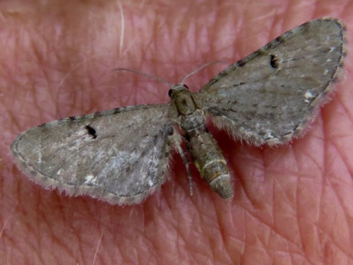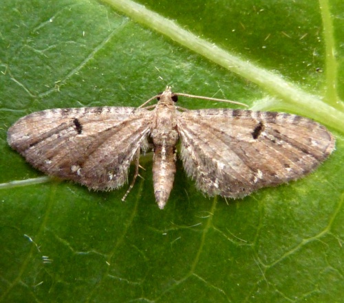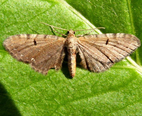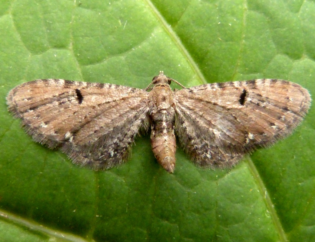 Although superficially similar to several other Eupithecia species, this moth usually has a distinct black mark on the forewing, a broken white subterminal line ending in a 'toothed' white blotch and a general chestnut colour to the forewings. Size can also help distinguish it from the Wormwood Pug. The wingspan of Currant Pug is 17-22 mm whereas Wormwood Pug has a wingspan of 21-23 mm.