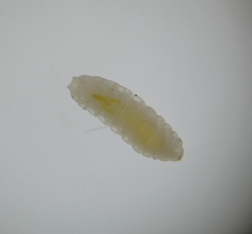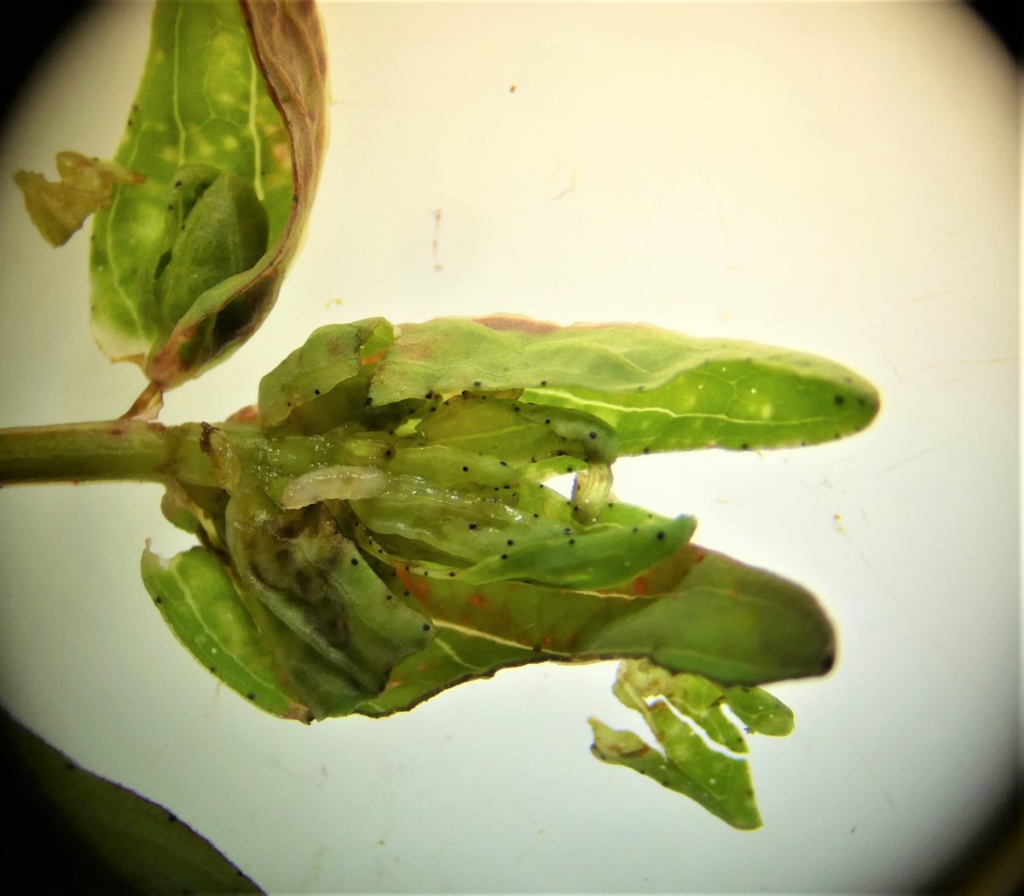 The larva of the midge Dasineura serotina produces galls on Hypericum species. The gall is formed out of the terminal bud of a stem. The hyaline white larva is surprisingly small in relation to its gall.