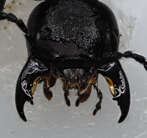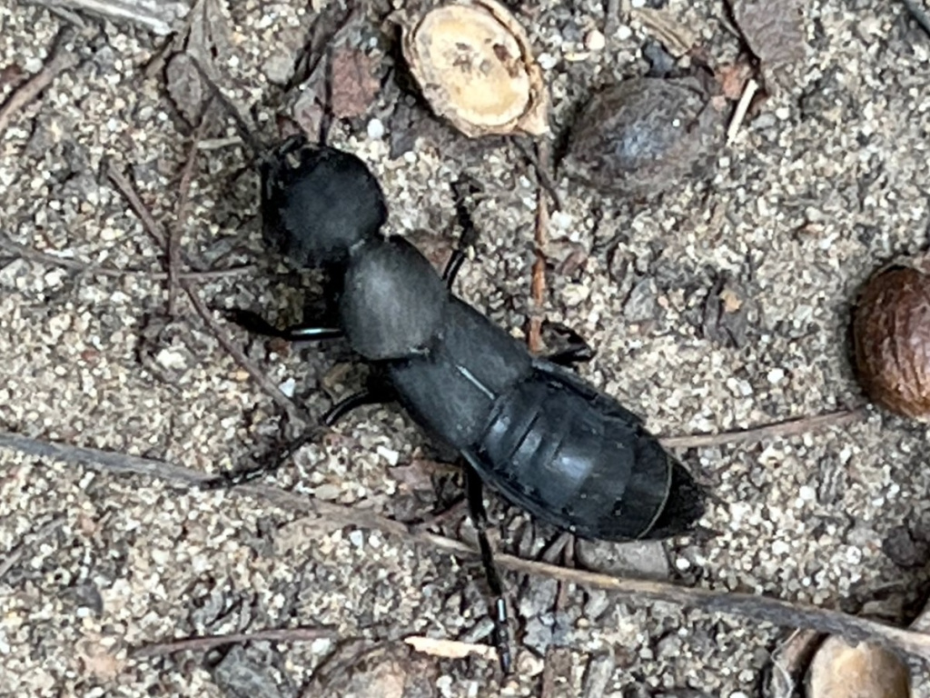 A large rove beetle with extended exposed abdomen covered by hardened plates and composed of 8 segments. Uniformly black body covered in fine, black hairs (setae). Shortened wing cases (elytra) which cover the thorax, concealing a folded second pair of wings which enable flight.