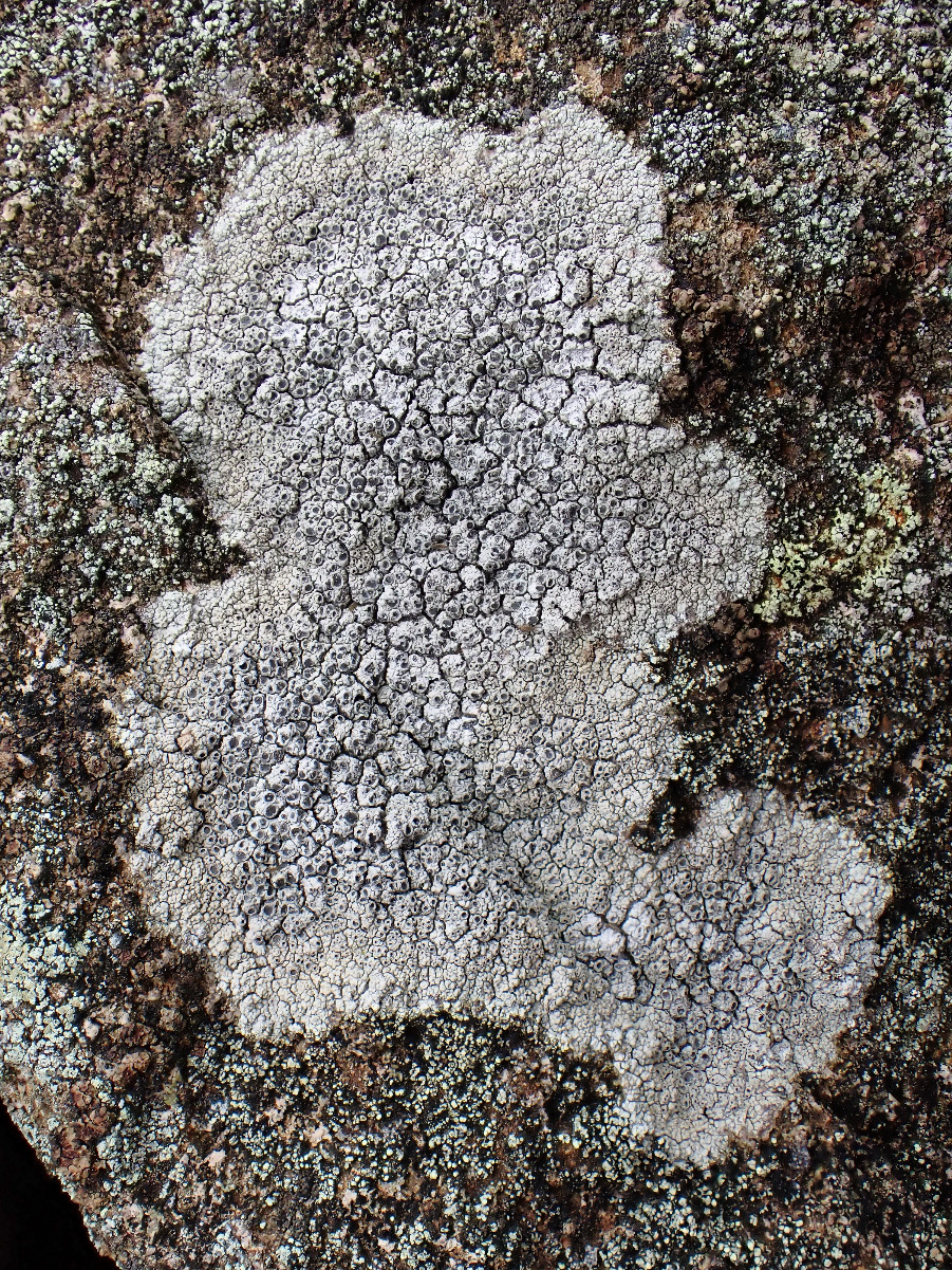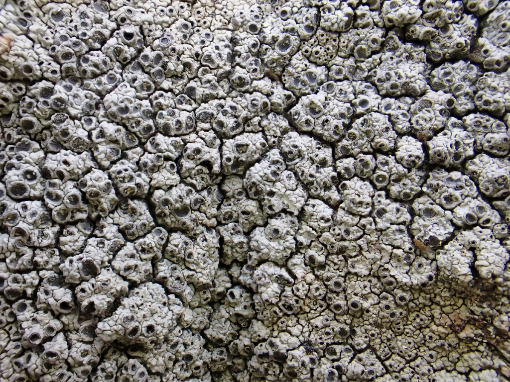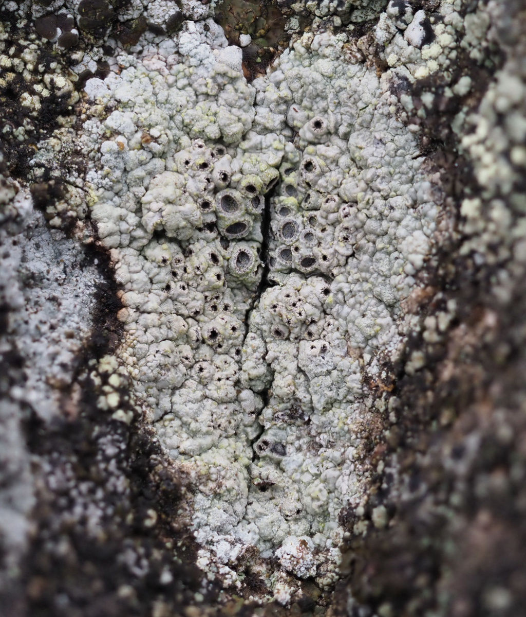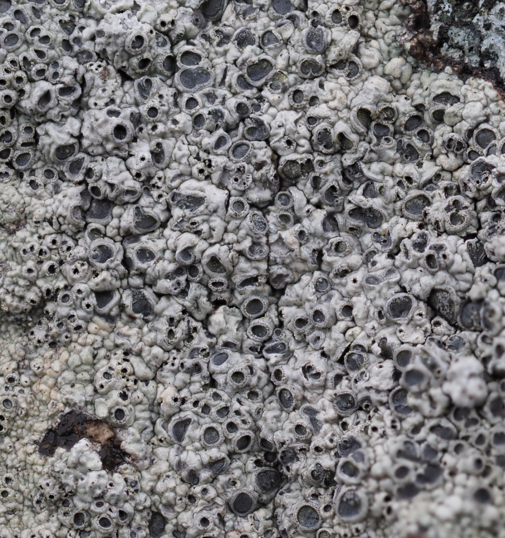 The thallus is grey, thick and warty and may have a yellowish tinge. The cup-shaped black apothecia grow up to 3mm and look like mini volcano craters.