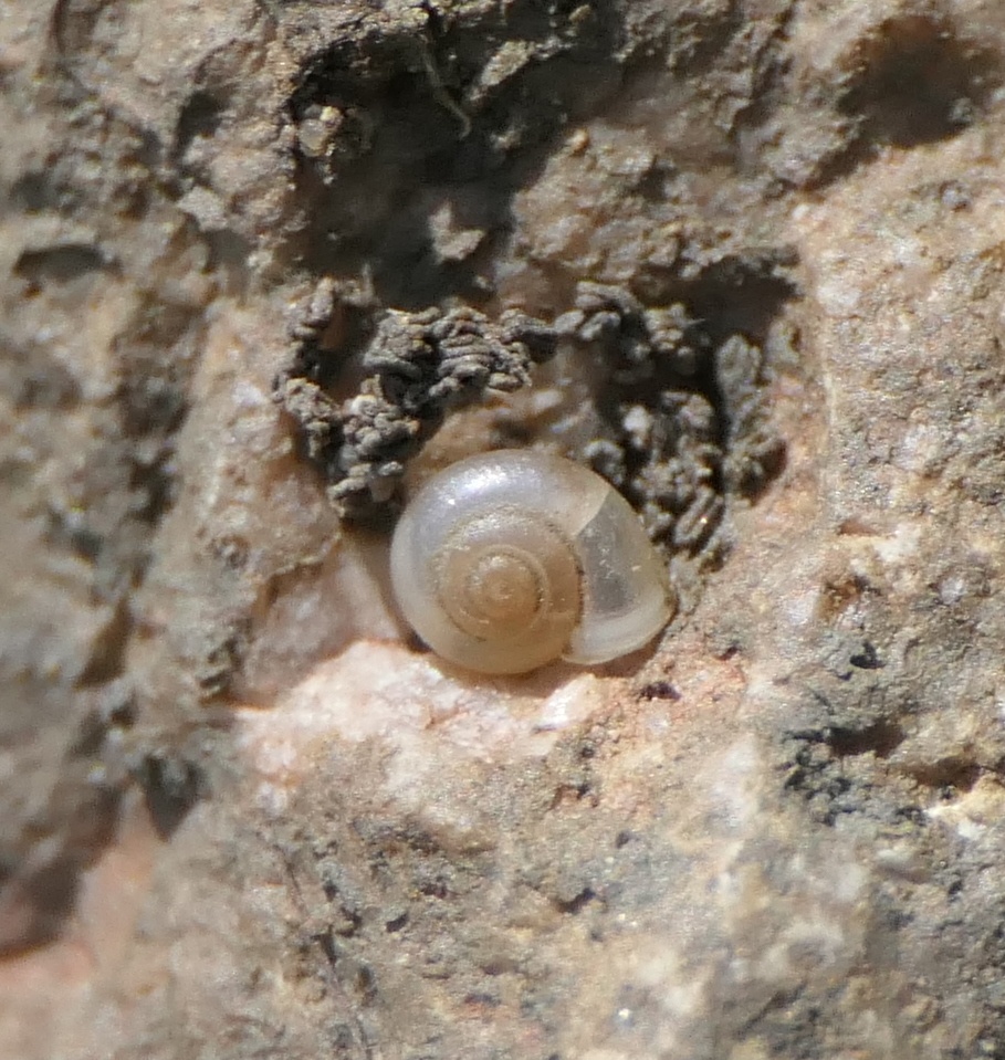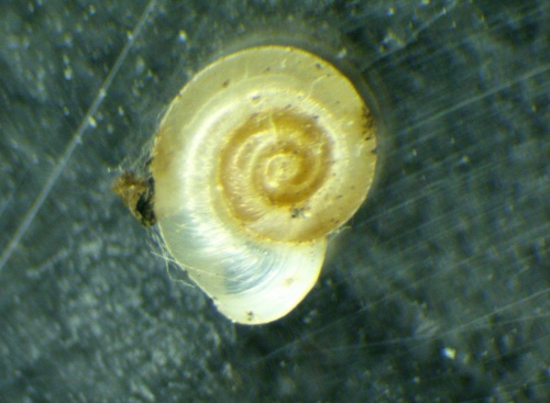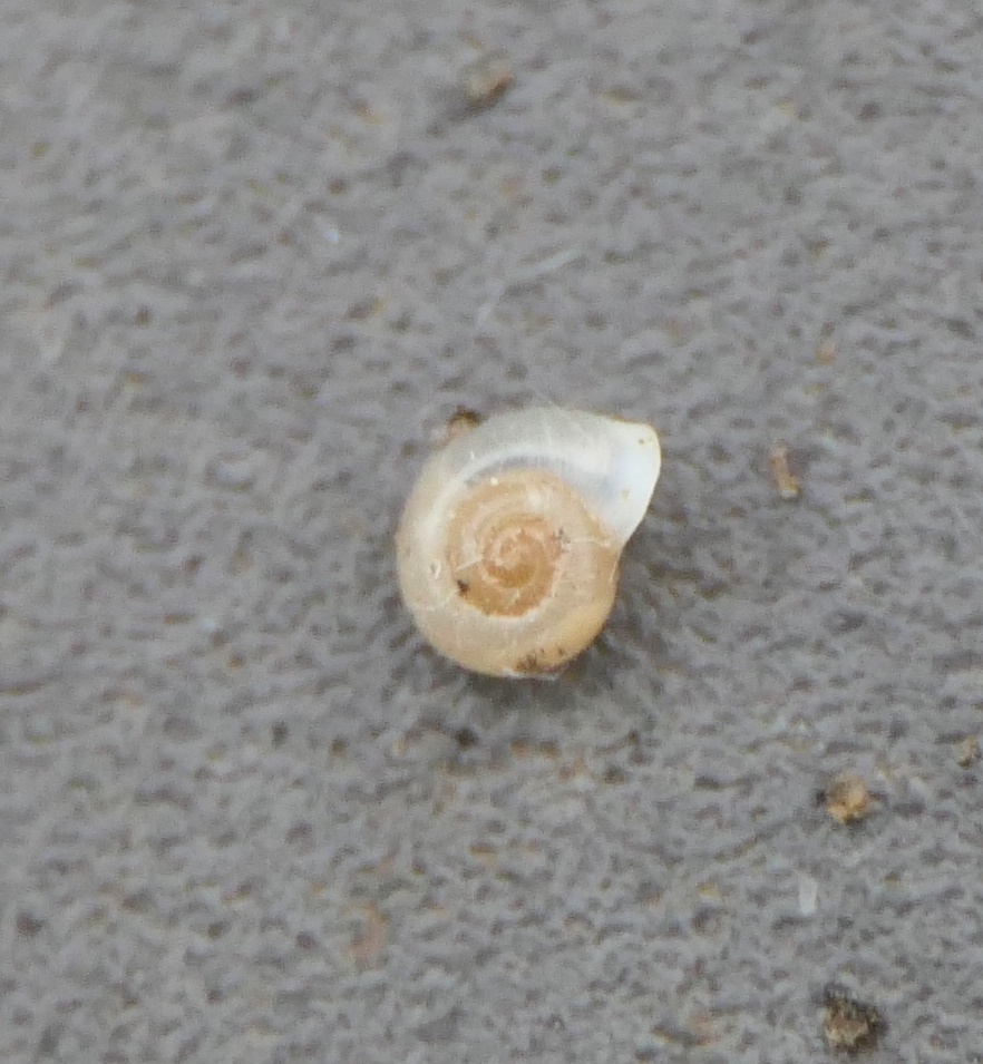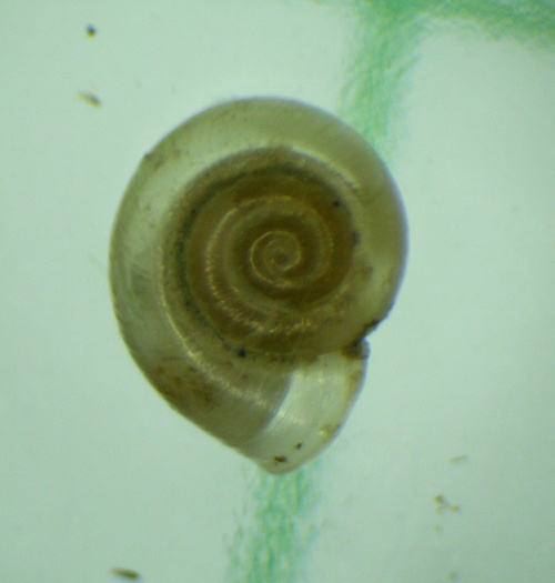 A very small snail (2mm) with a pale white or cream shell. It is flattened with a large umbilicus and a prominent lip around the mouth. The last whorl flares giving the shell and the umbilicus an eccentric appearance.