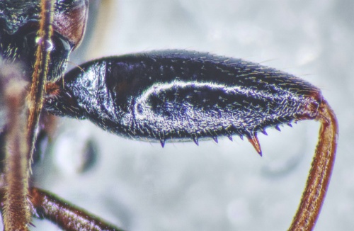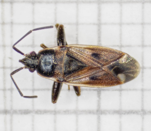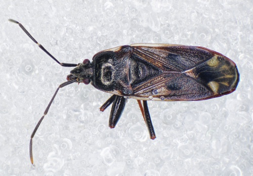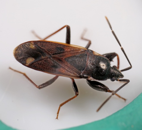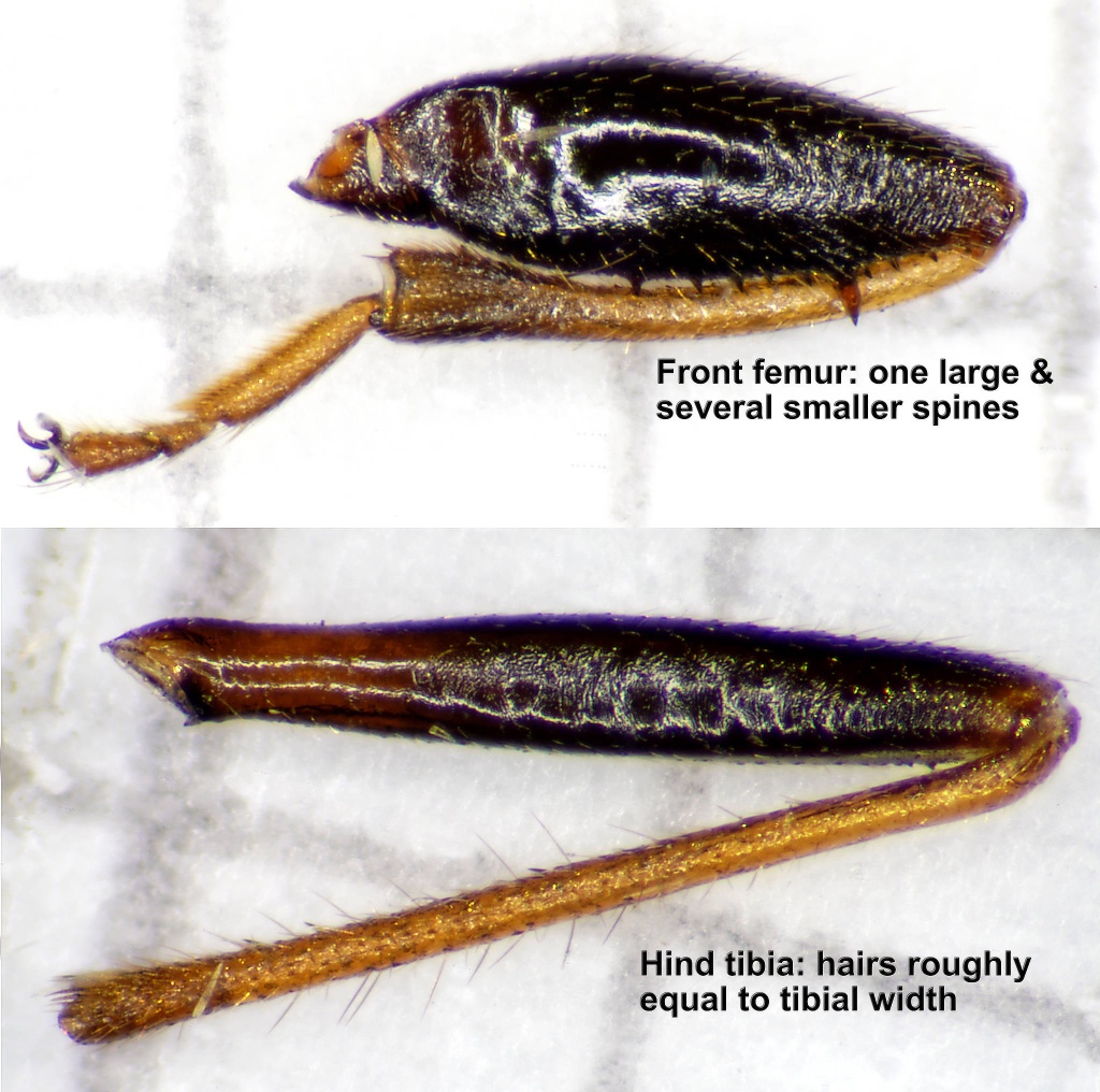 Medium/large (6-7.7mm) ground bug with reddish-brown forewings and a pair of semi-circular white spots on the membrane. E. fenestratus has one large and several smaller spines on the front femora. The stout hairs on the hind tibiae are roughly equal to the tibial width (shorter in E. abietus).