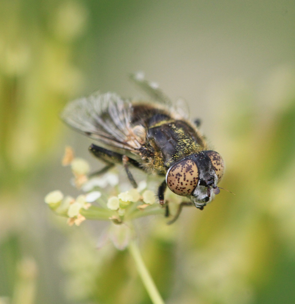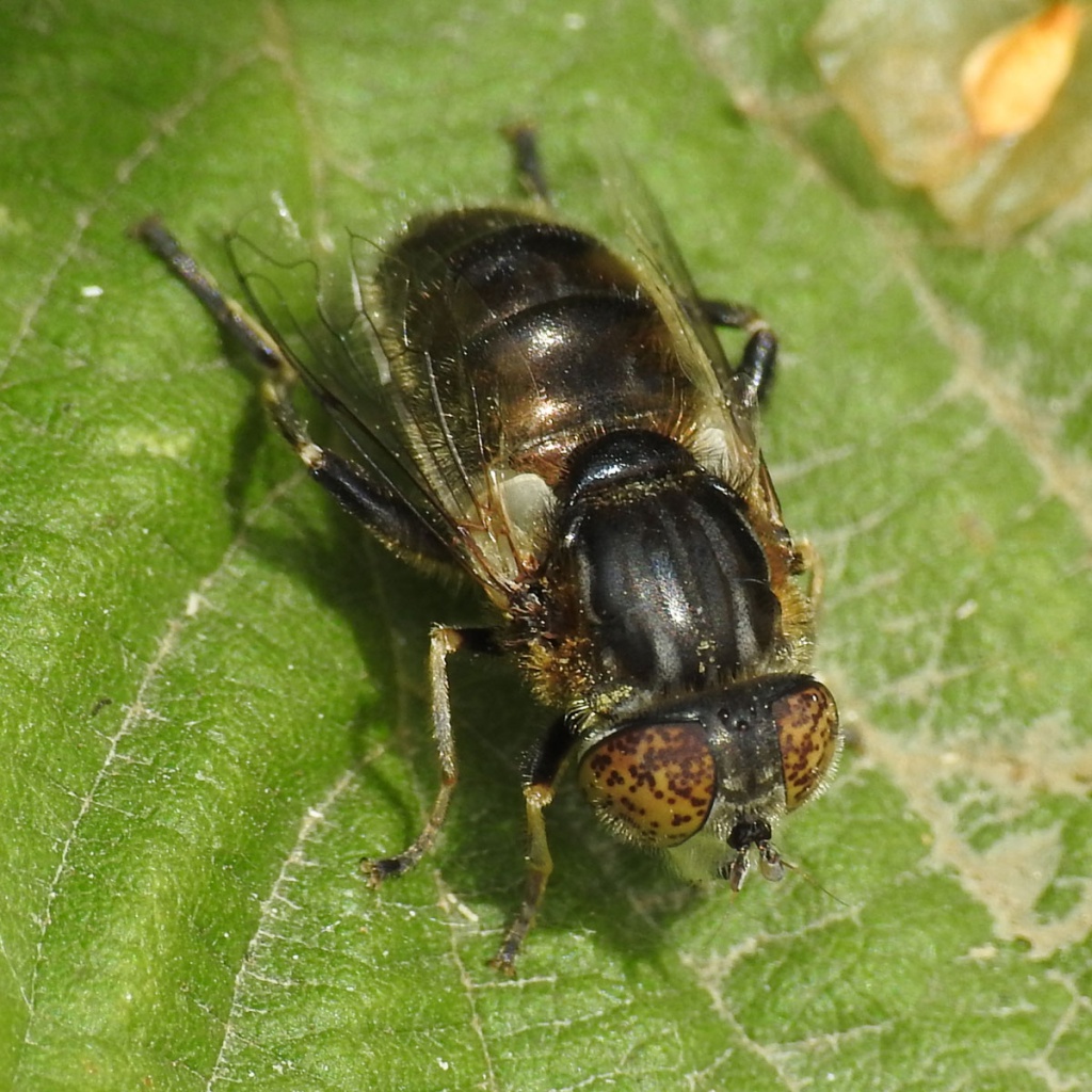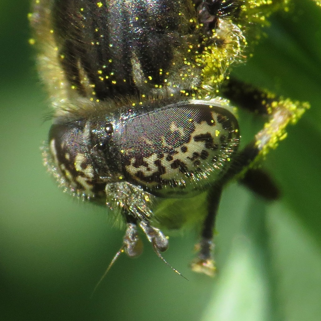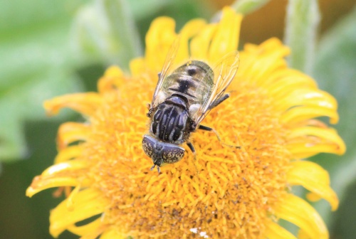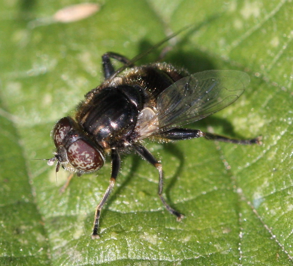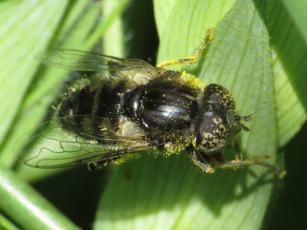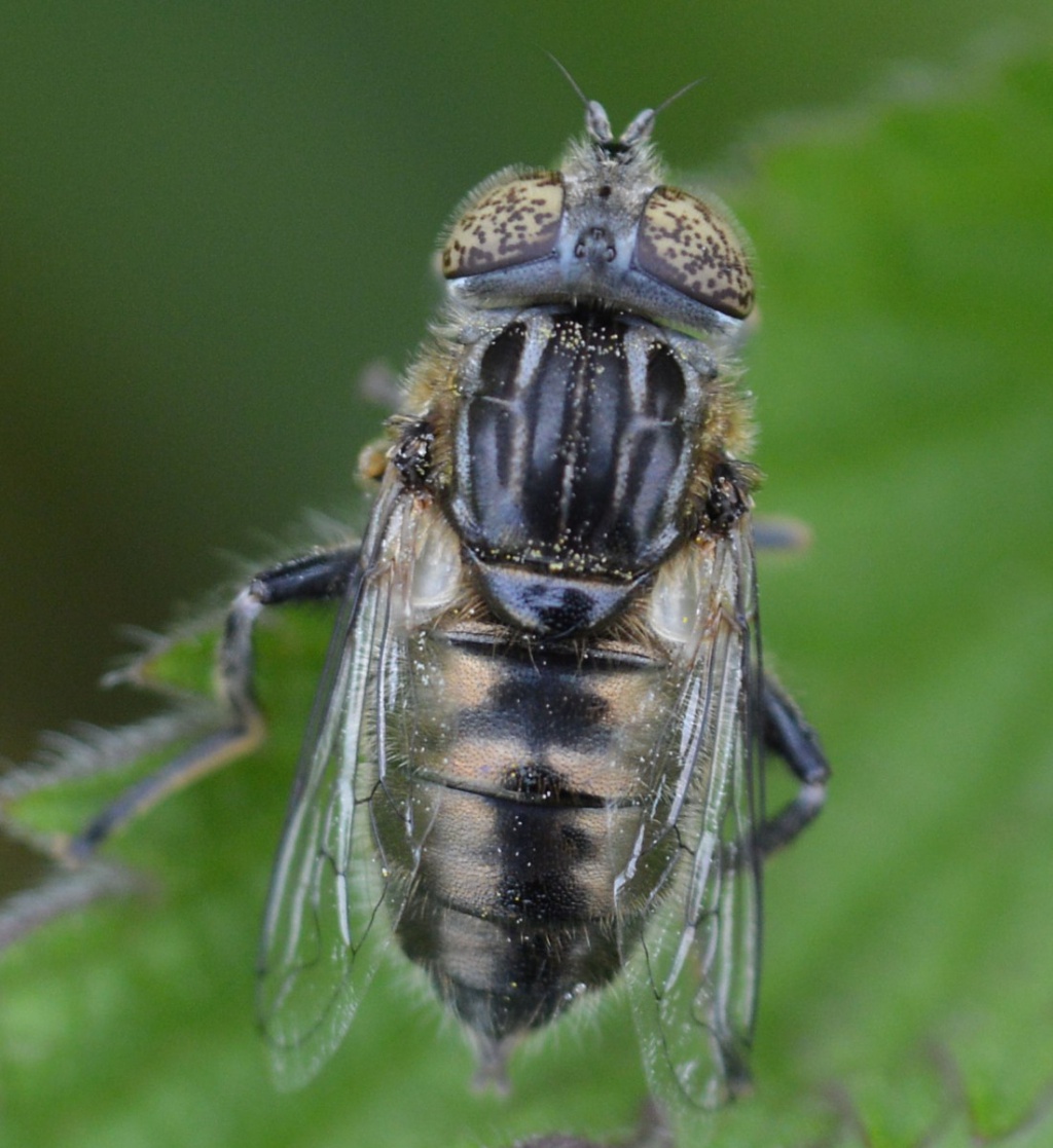 The abdomen is shiny black or bronze at the sides and it usually has pale thoracic stripes.