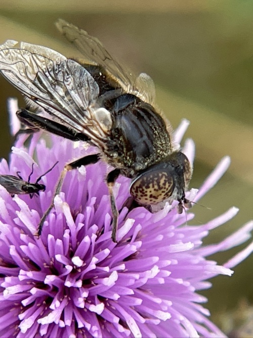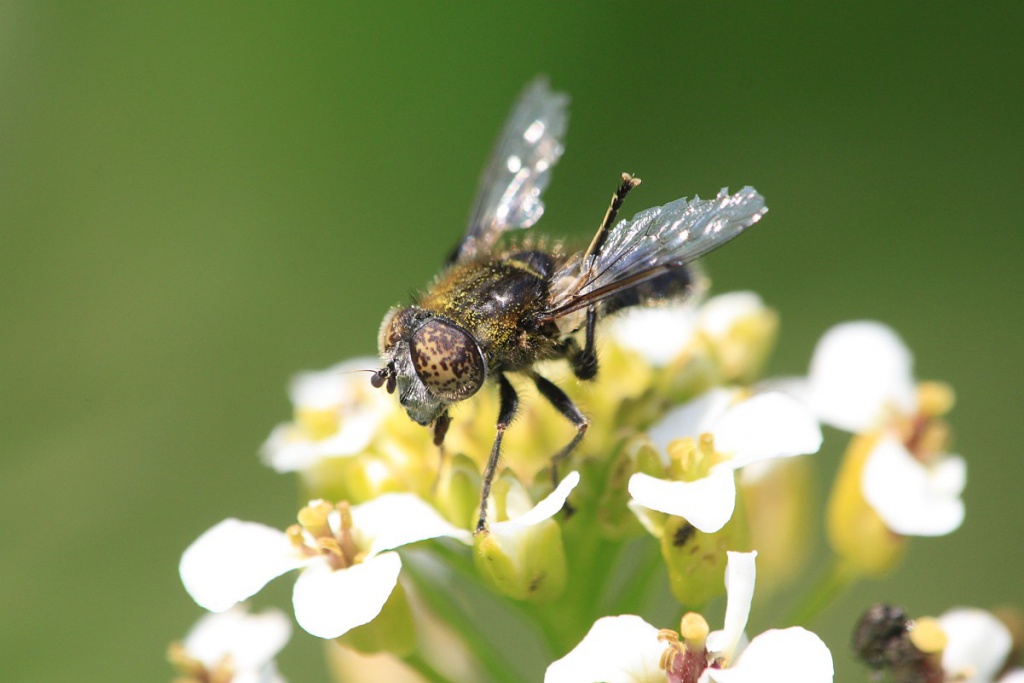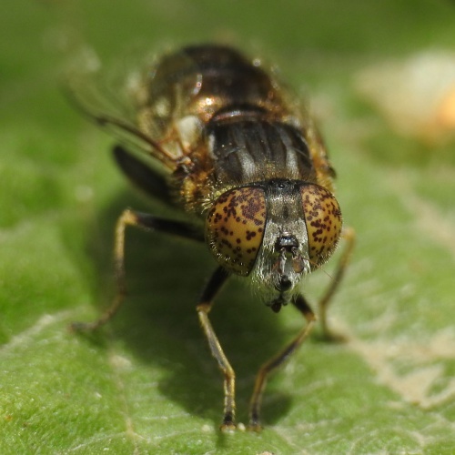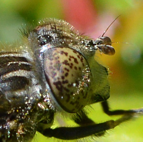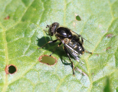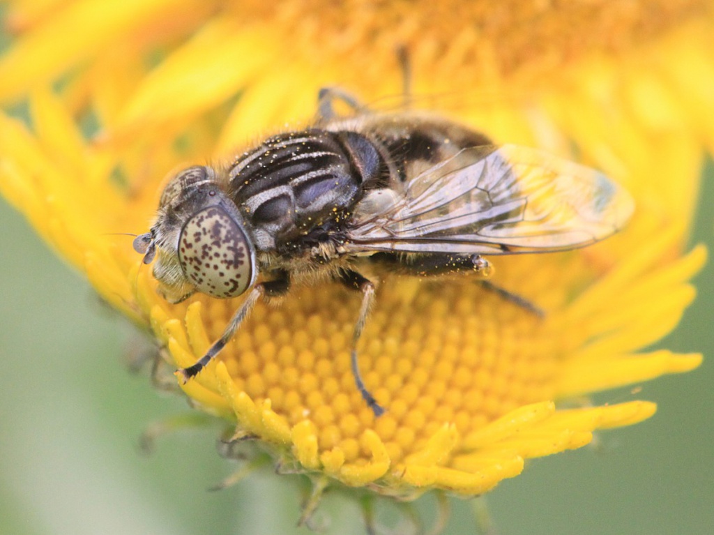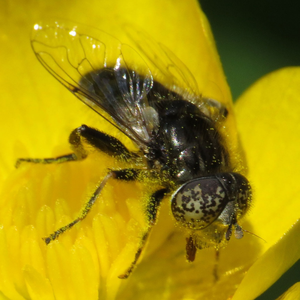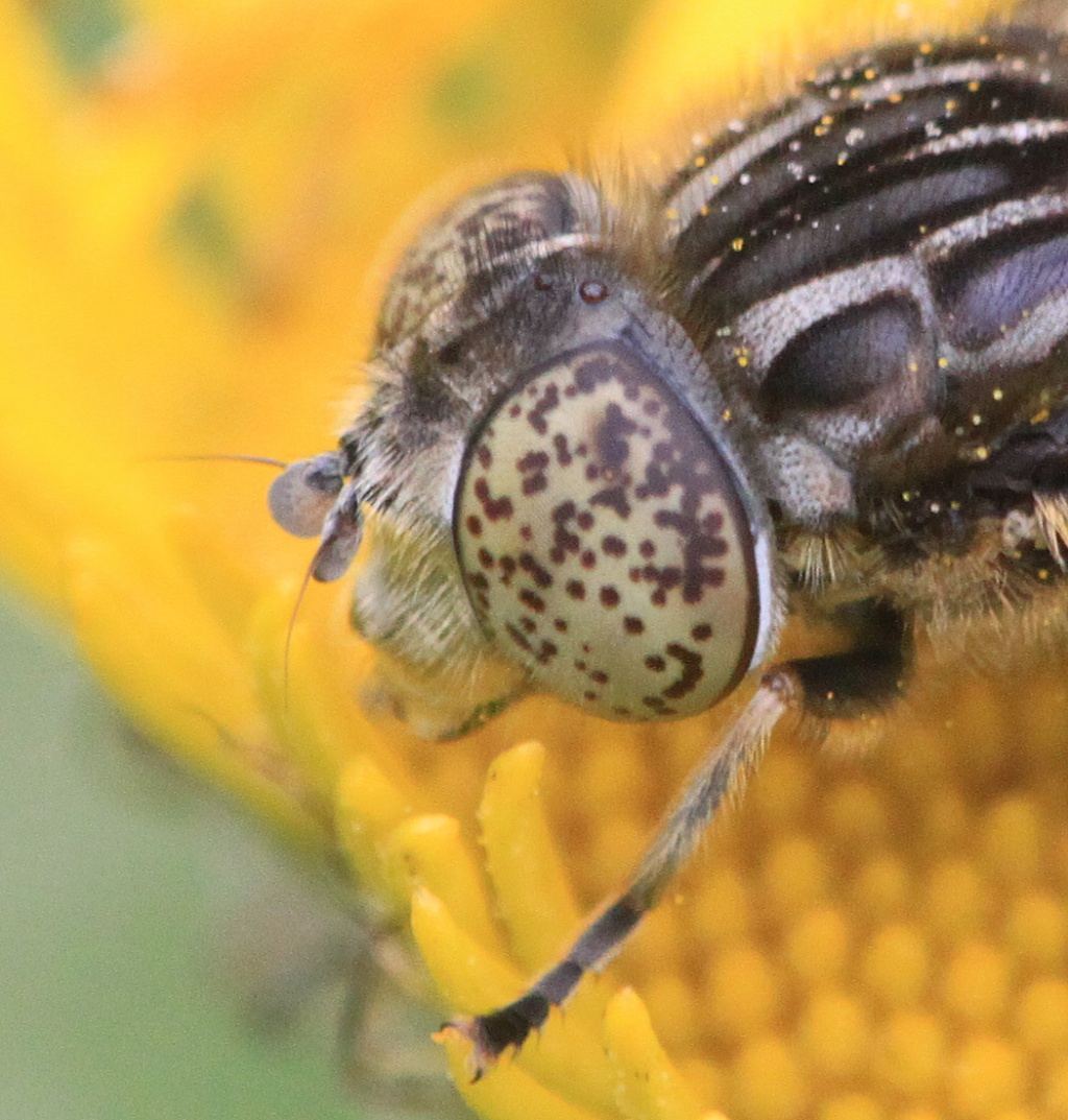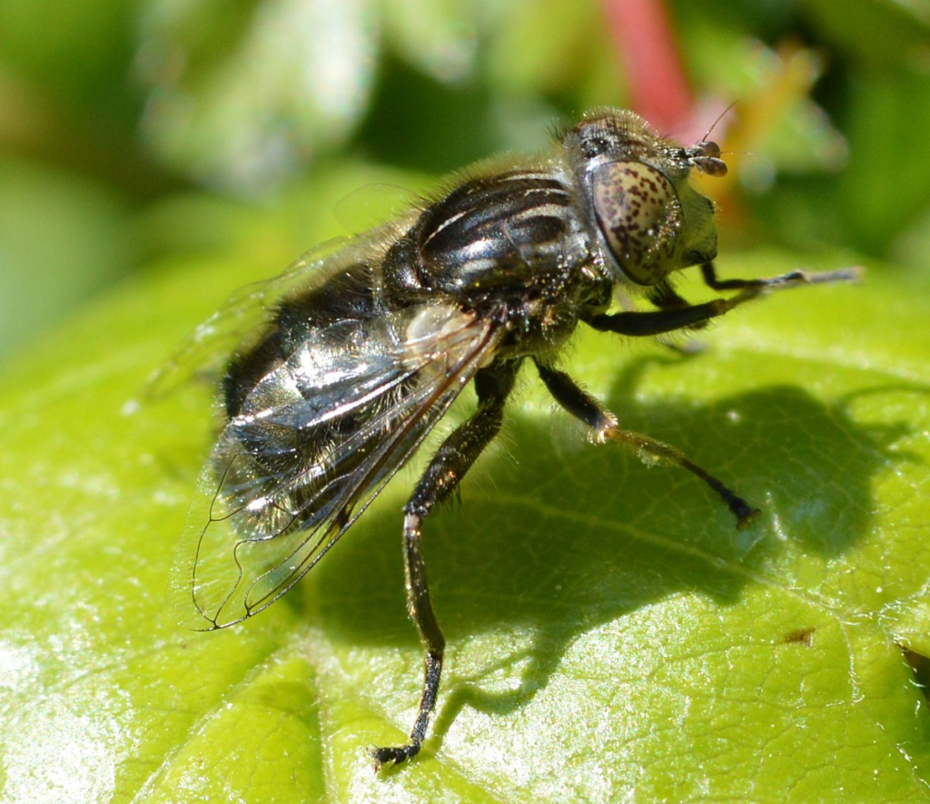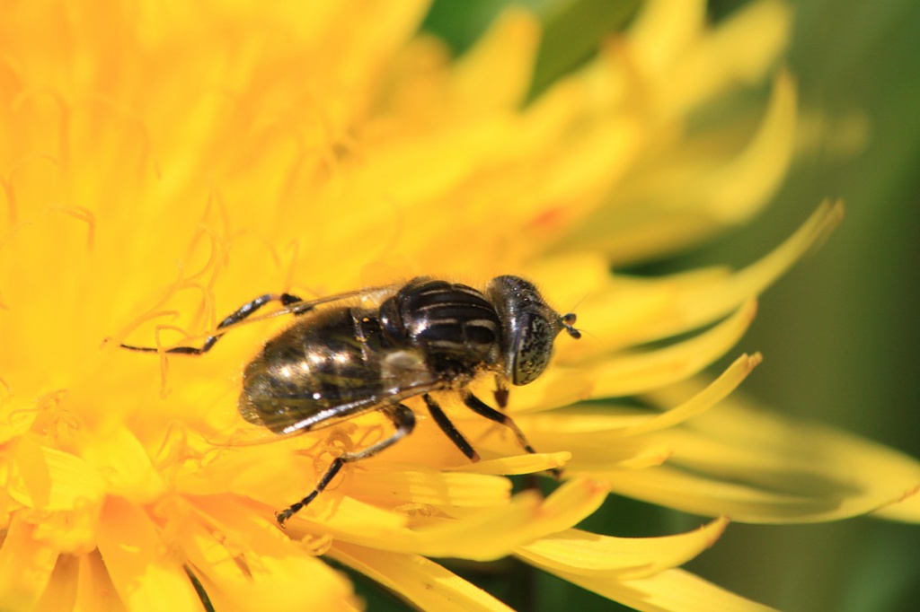 The abdomen is shiny black or bronze at the sides and it usually has pale thoracic stripes.