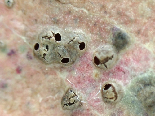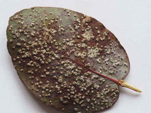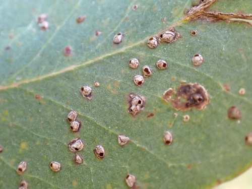 Ophelimus maskelli is a species of Chalcid Wasp about 1mm long and mainly blackish in colour. The larvae produce galls on the leaves of Eucalyptus species, particularly Eucalyptus camaldulensis. The galls are numerous, pale green to reddish pustules measuring about 1 mm, sometimes with up to 100 galls on a single leaf. After the wasp has vacated the gall, a conspicuous opening remains in the top.