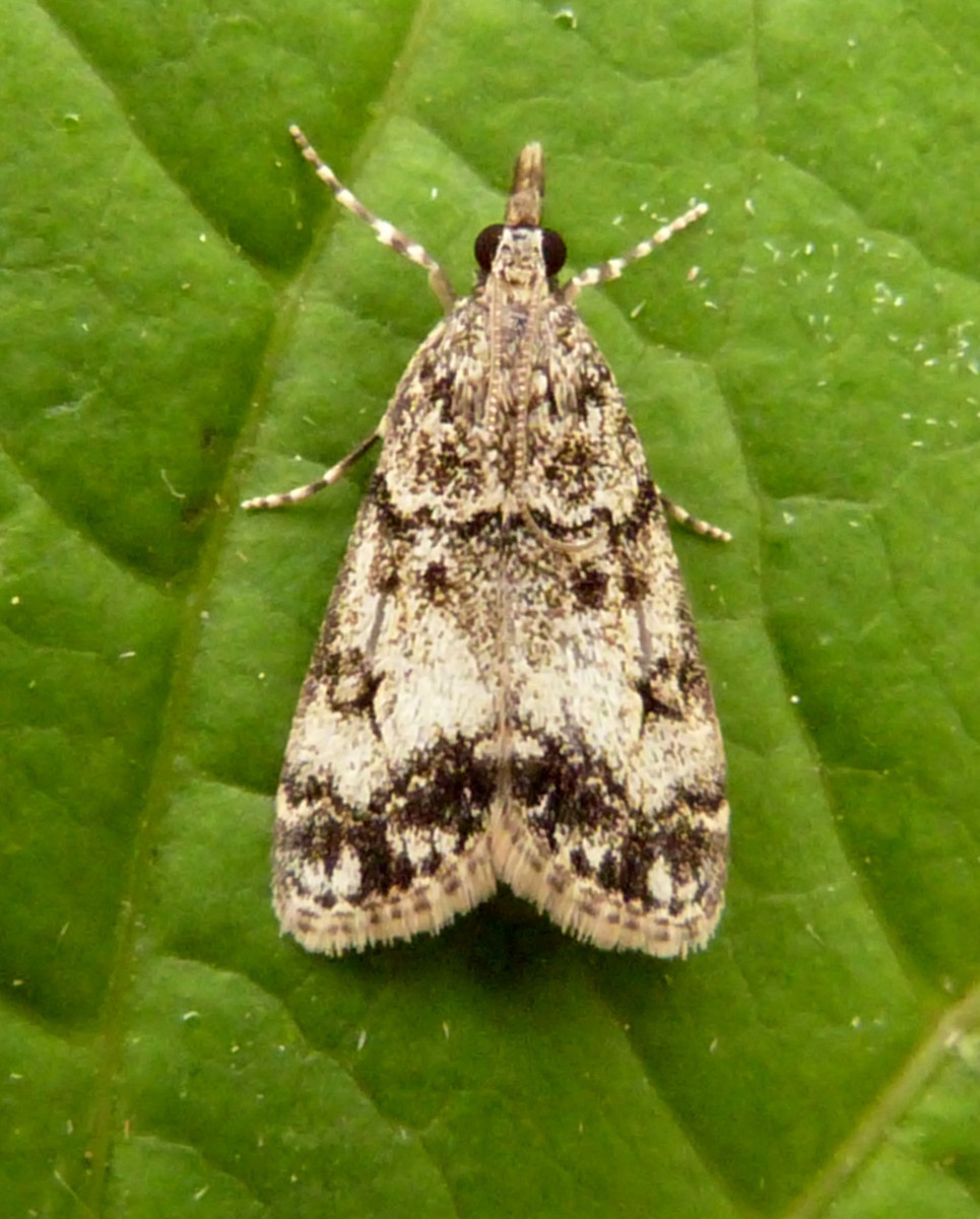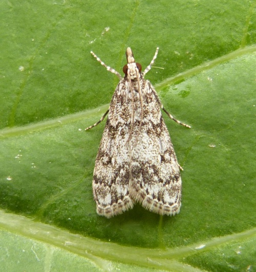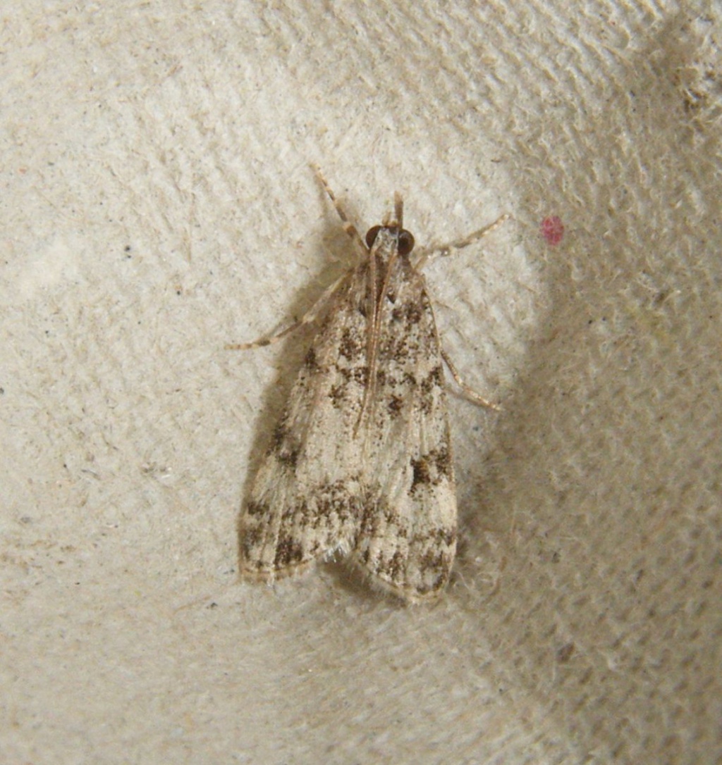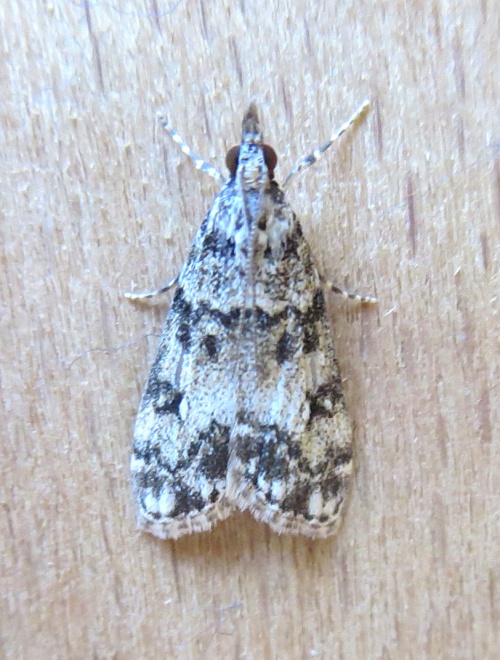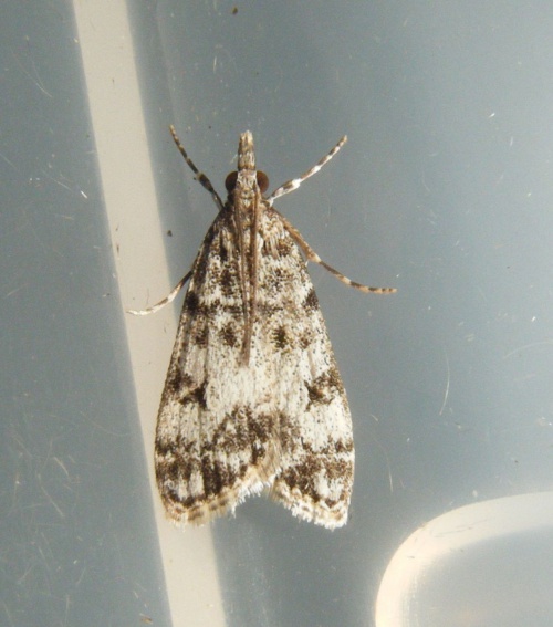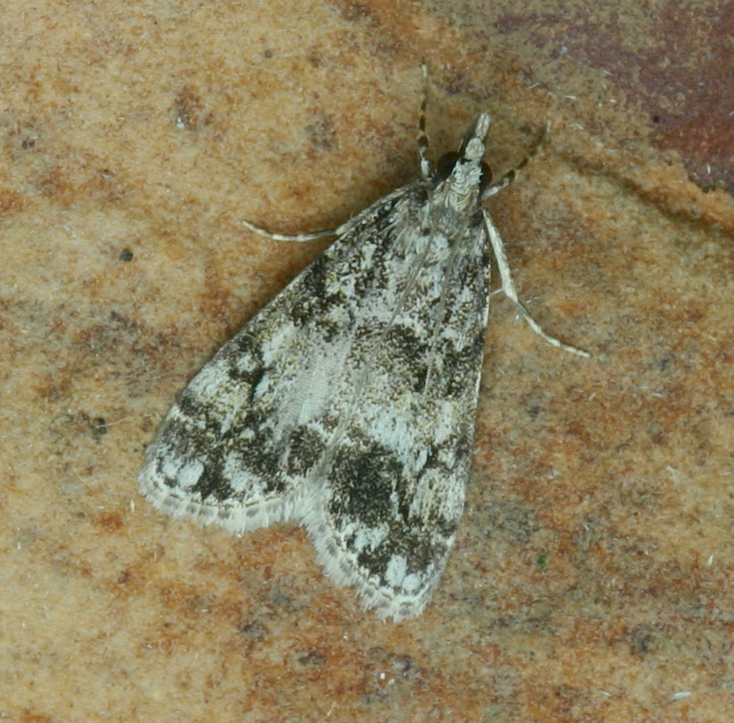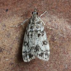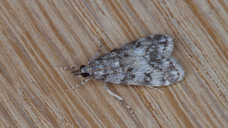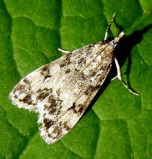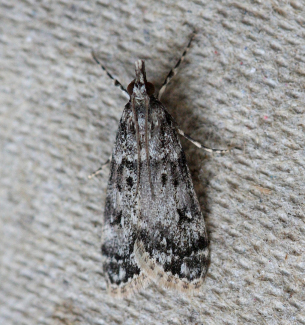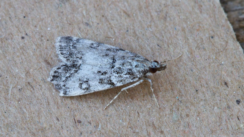 Wingspan 15-20 mm. One of the more distinctive of the Scopariinae, identifiable by its rather plain creamy or greyish central portion of the wing.