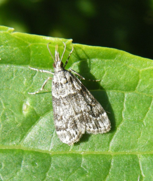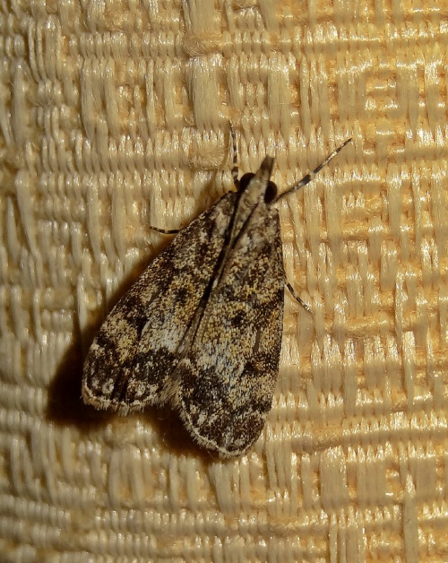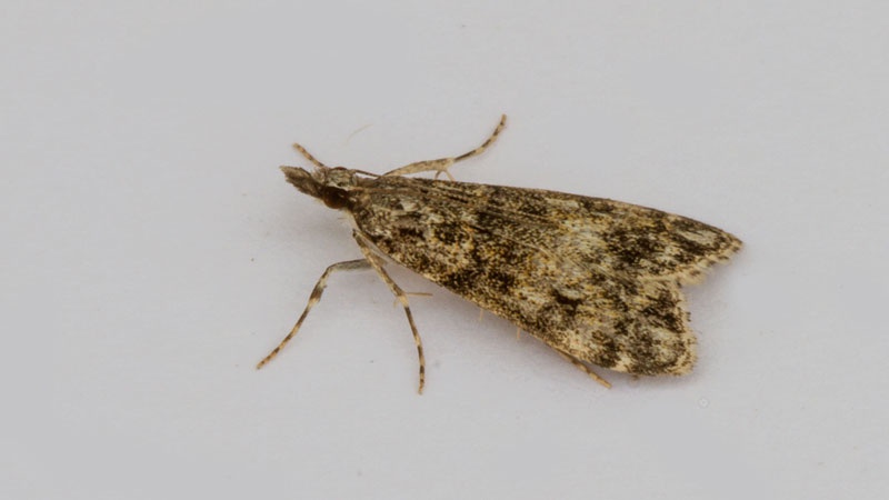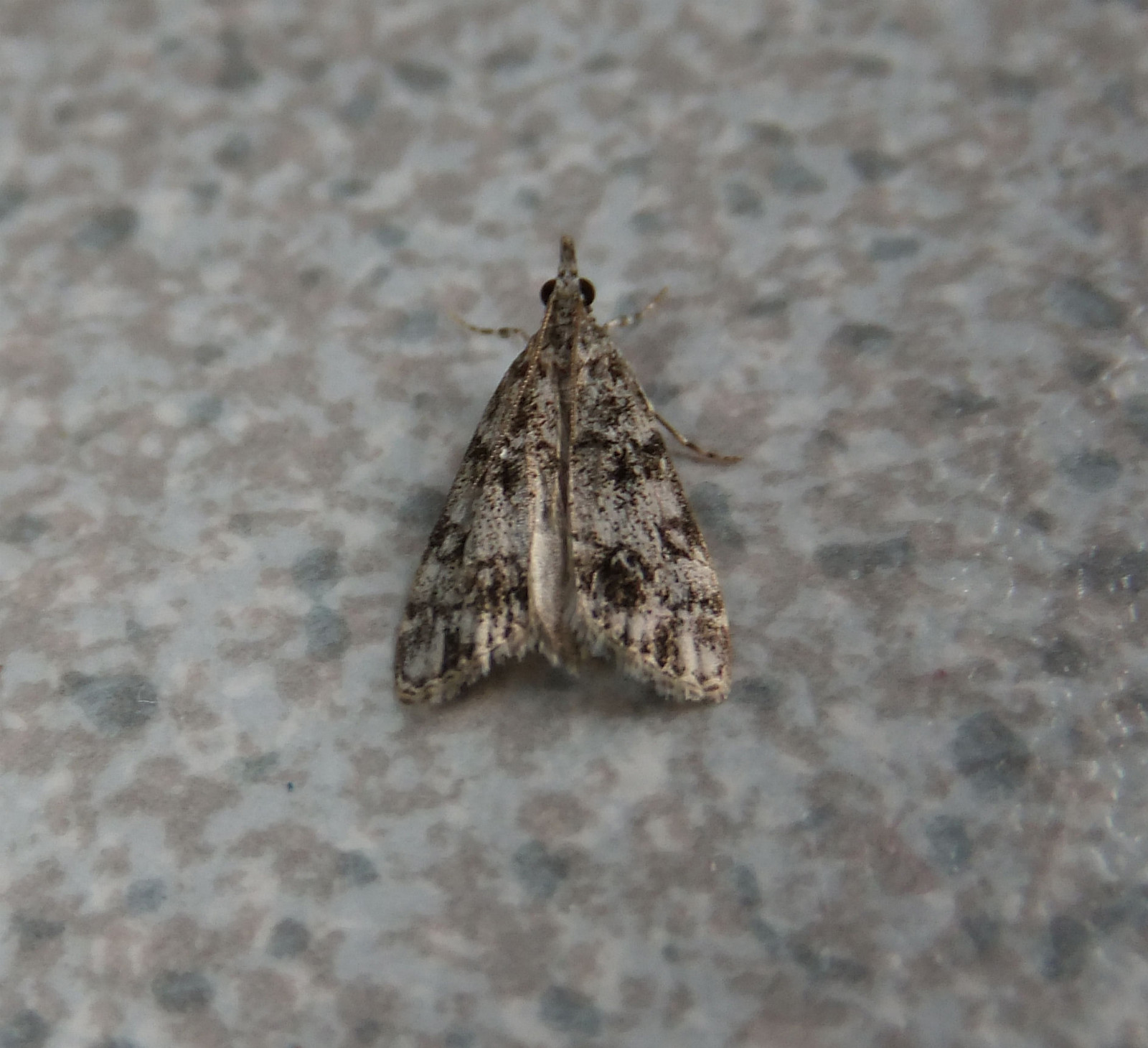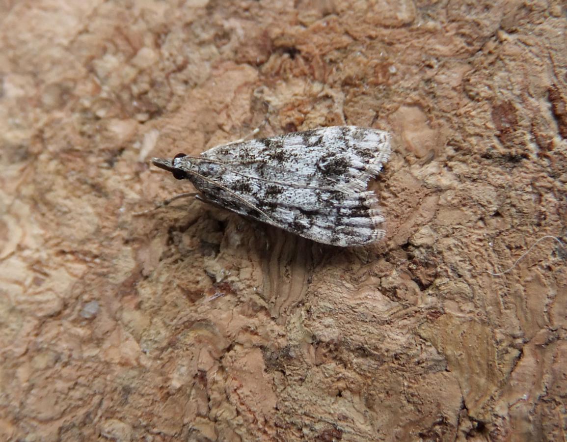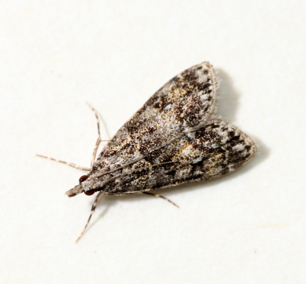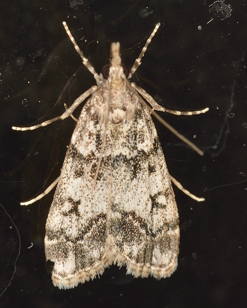 Wingspan 15-20 mm. One of the more distinctive of the Scopariinae, identifiable by its rather plain creamy or greyish central portion of the wing.