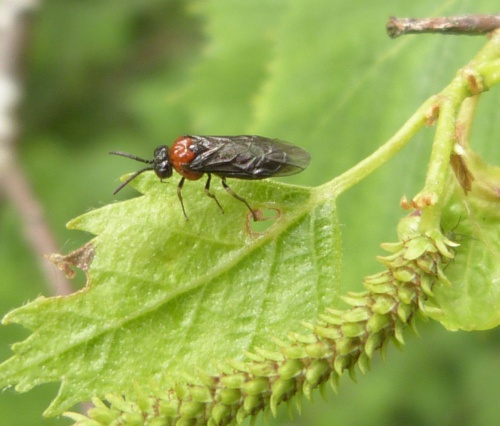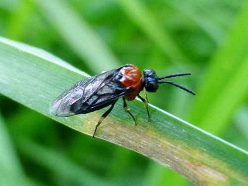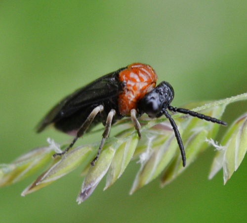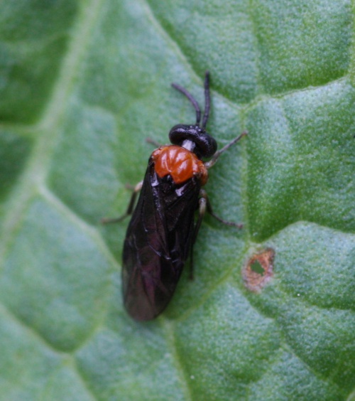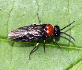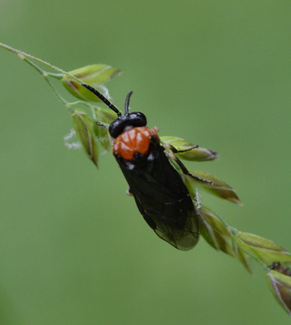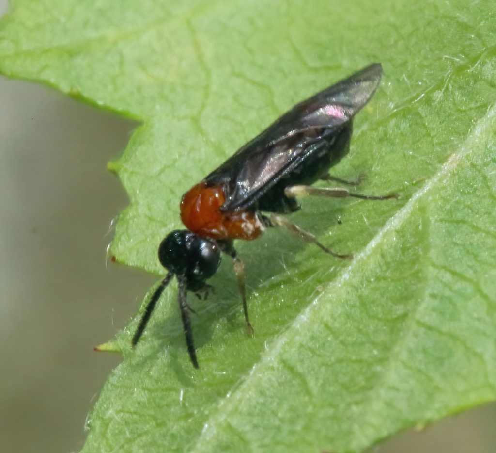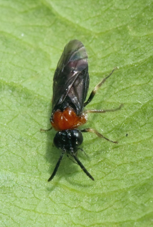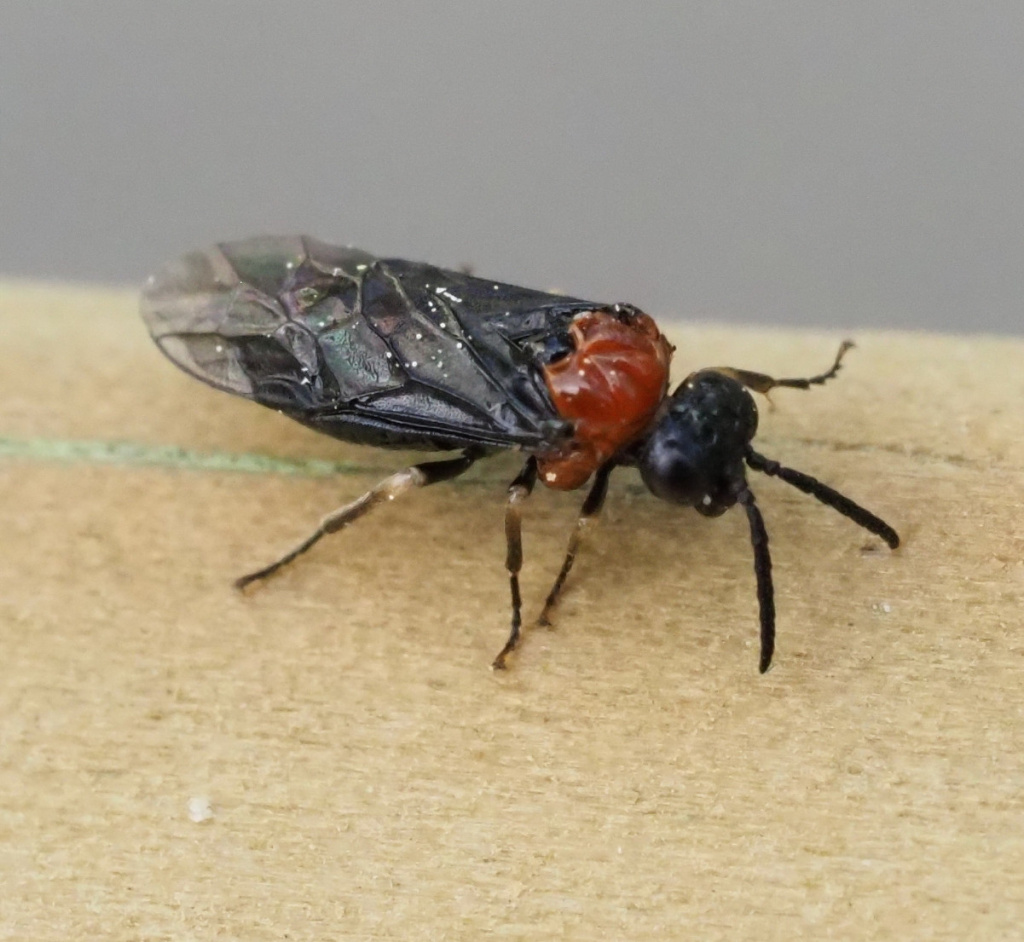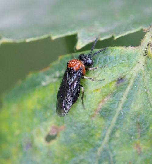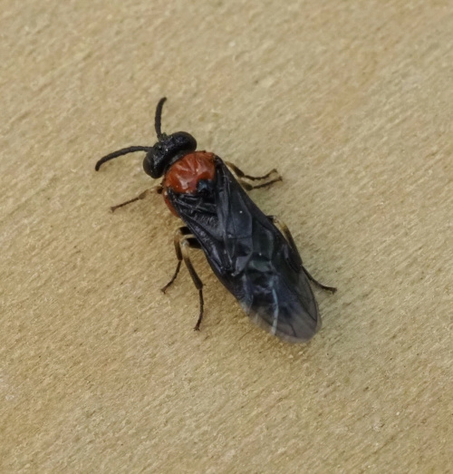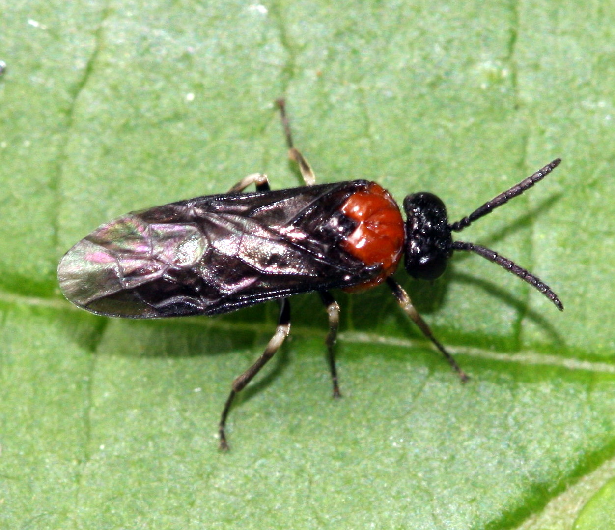 5-7mm. This sawfly is black with red on the top of the thorax. The black legs have a pale band around the joint of the femora and tibia.