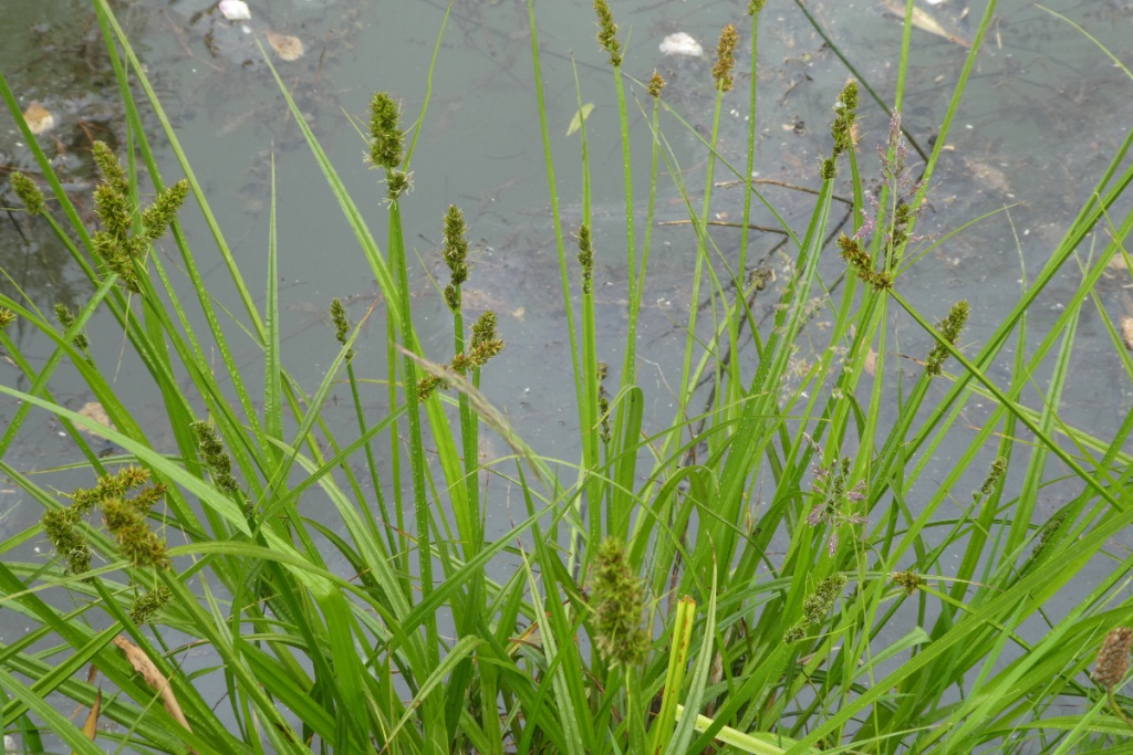 A densely tufted plant the stems have scarcely winged angles, unlike True Fox-sedge. It has narrow, elongated orangey brown panicles and bristle like long bracts with green bases.