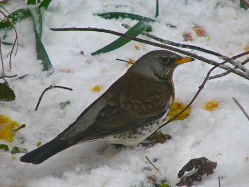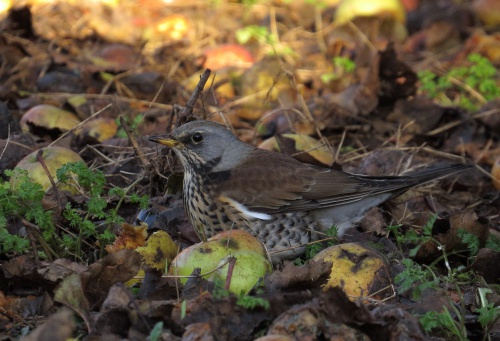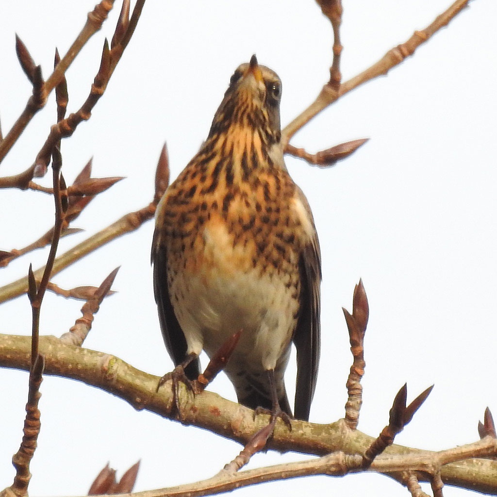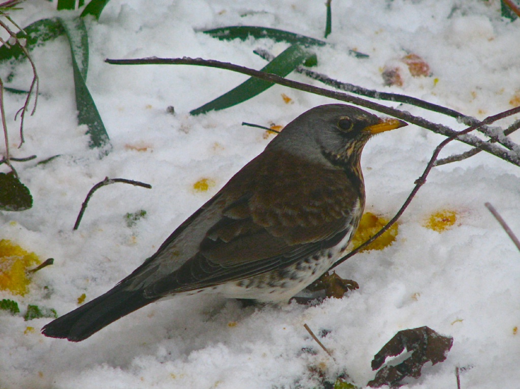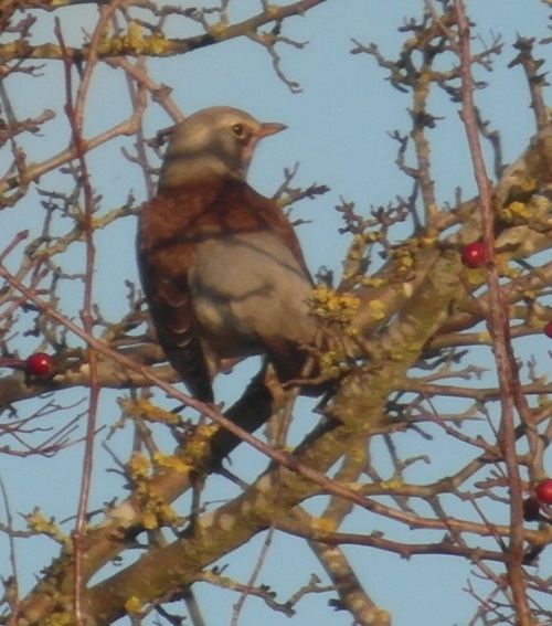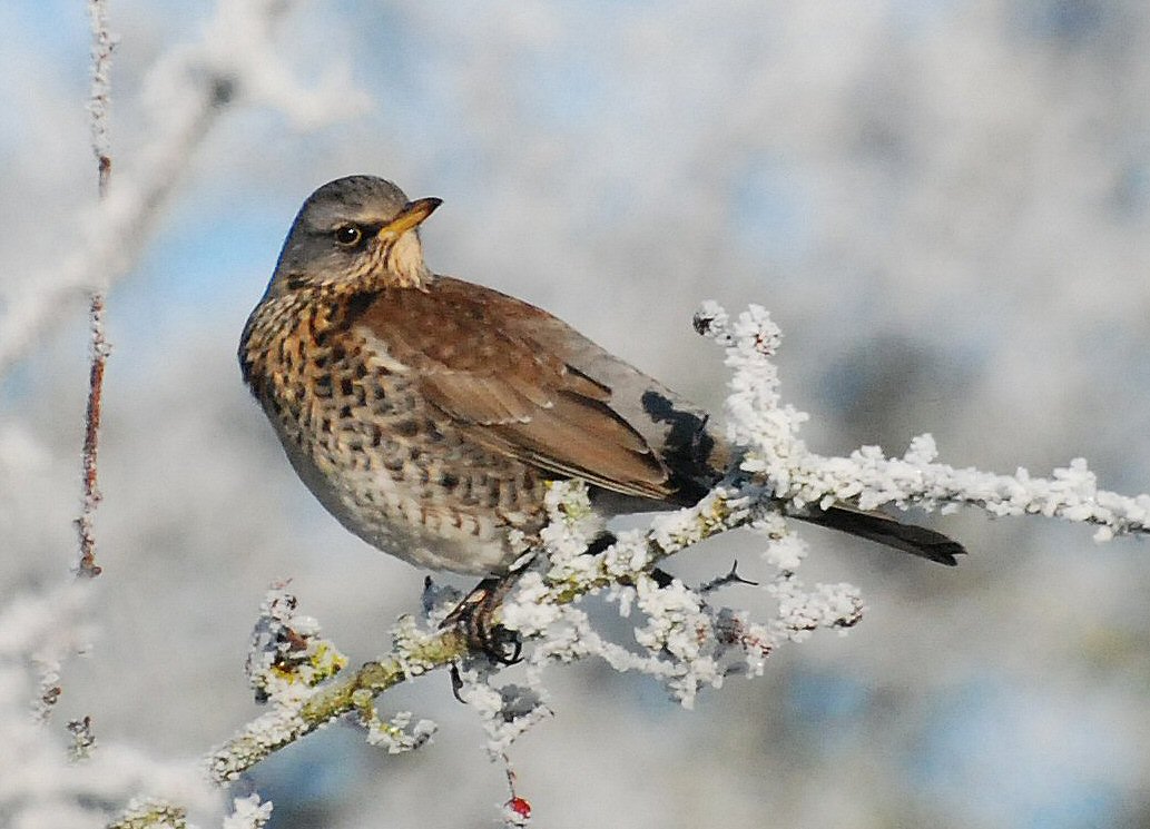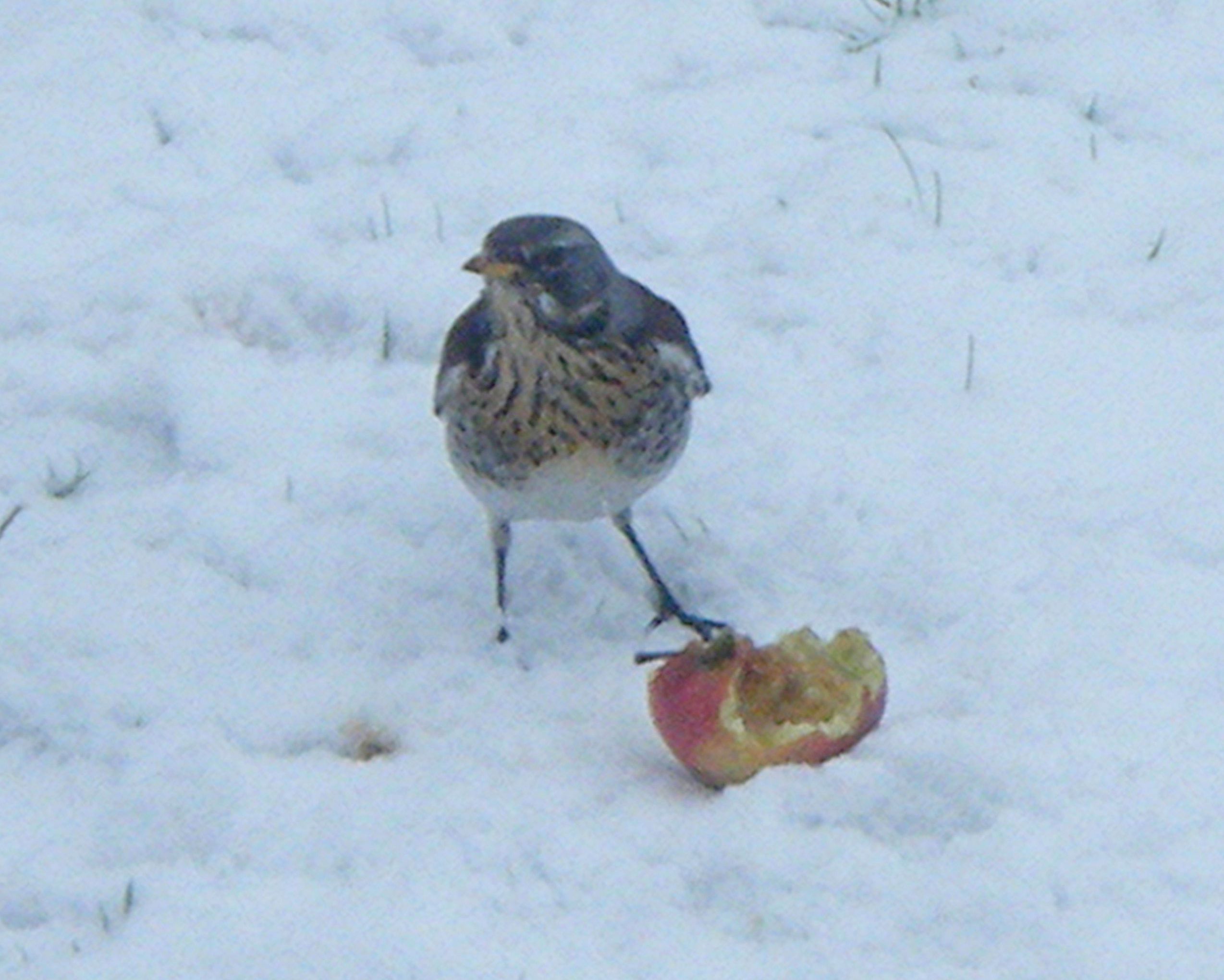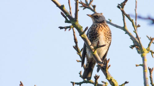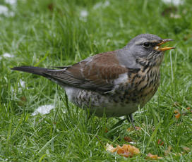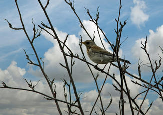The Fieldfare is a large thrush which appears mainly in flocks during winter, often together with Redwings.
