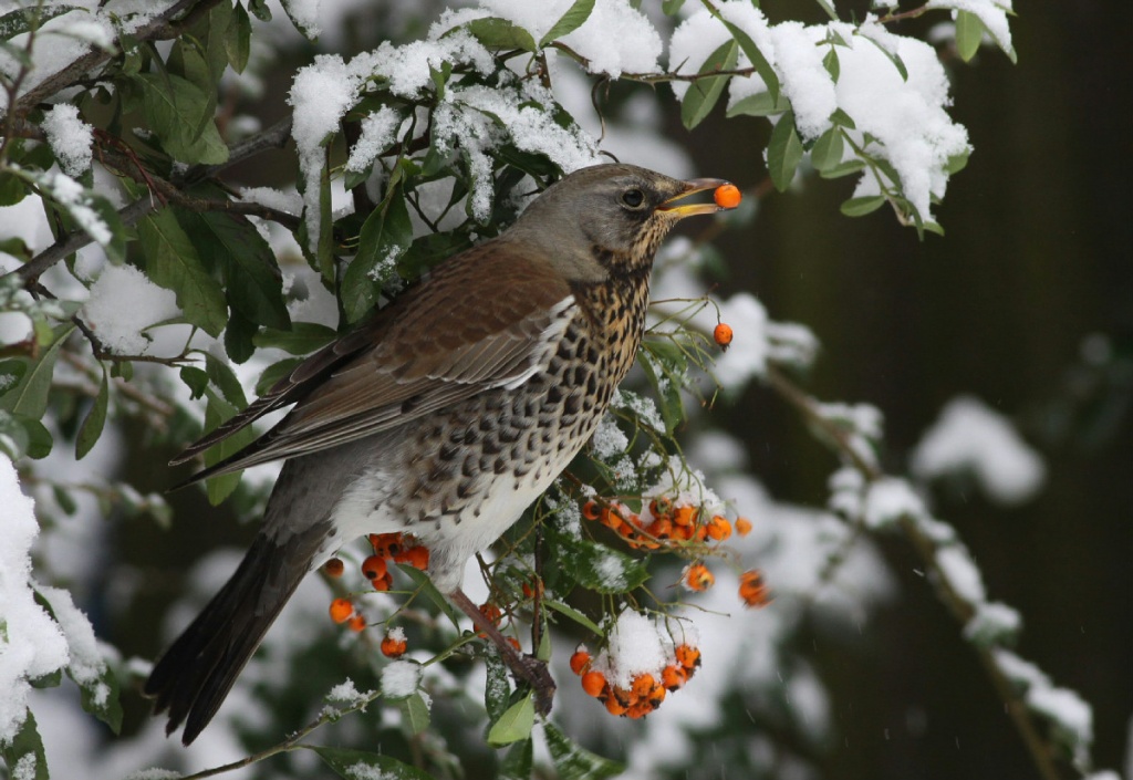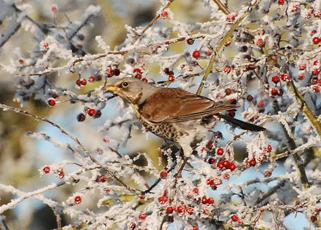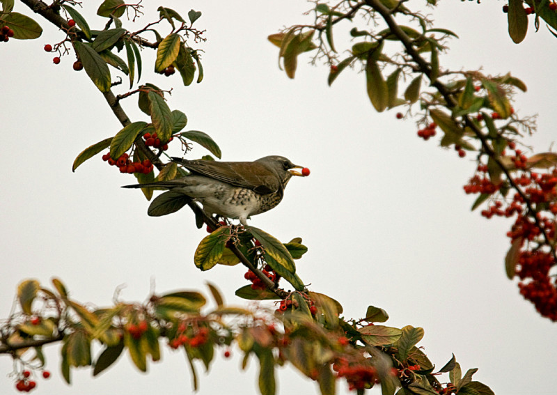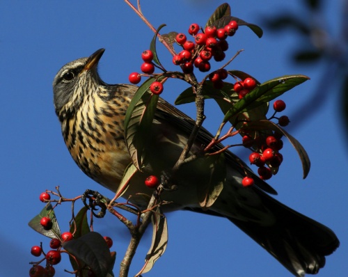 This bird eats worms, insects and berries. In harsh winters they visit gardens and can quickly strip all the berries from a bush.