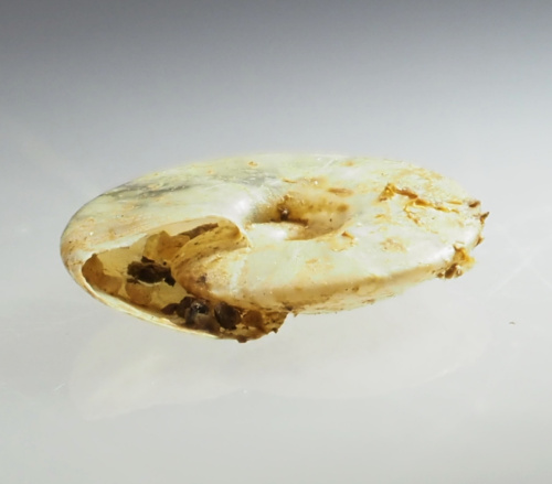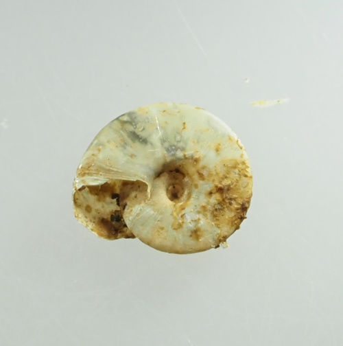 3-5mm in diameter. A small, pearly-looking ramshorn that is lens shaped with a smooth keel around the middle. The aperture (mouth) is very narrow and heart-shaped. The shell is thin and fragile with a grey, silky appearance (though not shining).