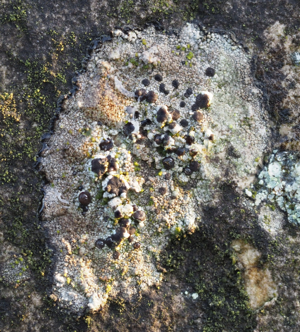 A crustose lichen which is mousy brown, though paler and greenish in the shade. It has a black prothallus which is often visible between cracks in the thallus. Apothecia are black or dark brown with paler margins.