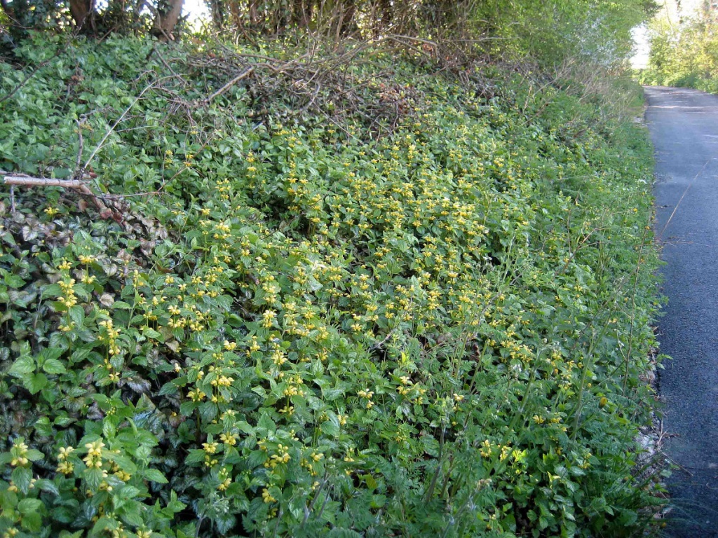 Often patch forming it is similar to the native Yellow Archangel (Lamiastrum galeobdolon subsp. montanum) but the naturalised plants of Garden Yellow Archangel (subsp. argentatum) have silvery markings on the leaves. Flowers bright yellow with brownish markings, 17 to 21 mm long and borne in whorls on the upper half of the stem. Upper lip hooded the lower lip 3-lobed. The garden variety is rampant invader and can out-compete native flora, but is a useful garden nectar plant, particularly for long-tongued bees.