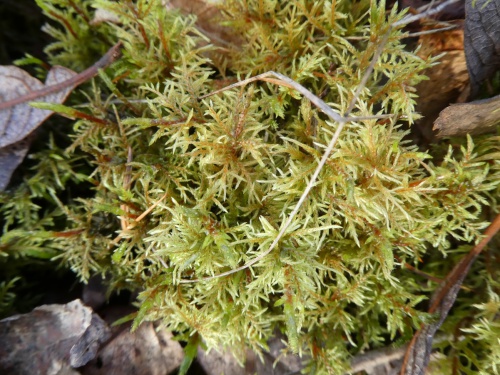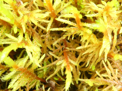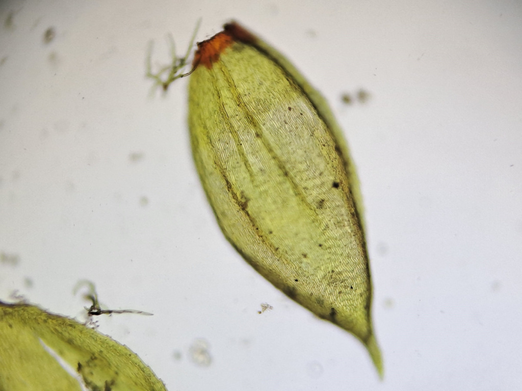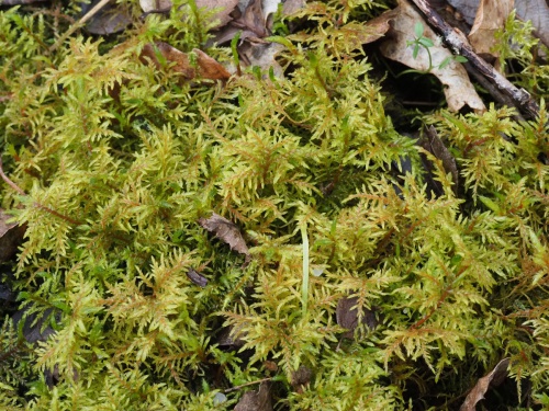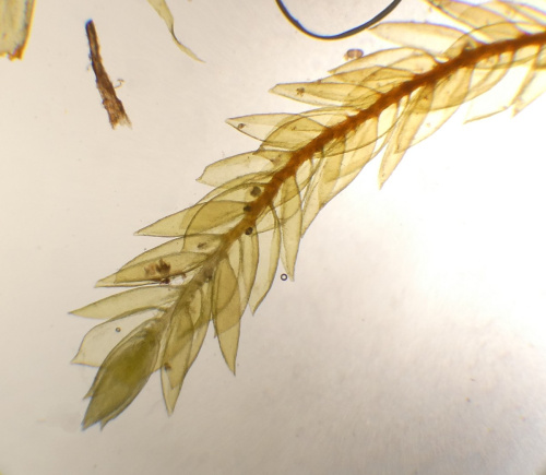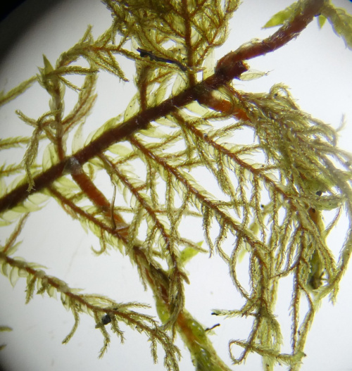 This glossy, bright green, robust moss has regularly arranged, branched branches (bipinnate) and a red stem. Shoots are several to 10 or even 20 cm long. A ‘flight of steps’ appearance to the shoots is a consequence of varying rates of growth during successive seasons from a bud behind the shoot tip. Stem leaves are quite large, 2.5 to 3 mm long, and oval with a long, tapering tip. Branch leaves are smaller (1 mm long), more concave and have a shorter tip. Both types of leaf have a short, double nerve (or may lack a nerve) and sharply toothed margins in the upper half. Under a hand lens, the stems and branches appear furry owing to the presence of branched filaments. Capsules are generally uncommon, but occasional in parts of south Wales and may be overlooked.