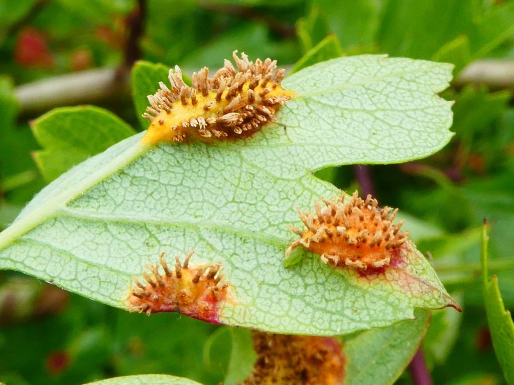 Hawthorn (Crataegus) are the alternate host for two gall-causing rust species in the genus Gymnosporangium. Aecia are produced on reddish swollen spots on leaves, fruits, petioles and shoot. The aecia have long fringes (peridia) so the aecia have a pale brown whiskery appearance. The aecial stages are very similar and species cannot be distinguished from field photos in this stage.