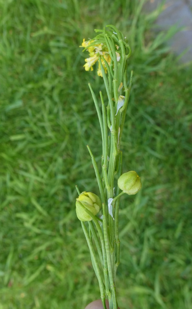 Medium to tall plant with spreading branches. Lower leaves deeply pinnately lobed, with a large terminal lobe. Flowers pale yellow, small 3 mm. Fruits short 10 to 20 mm closely pressed to the stem.