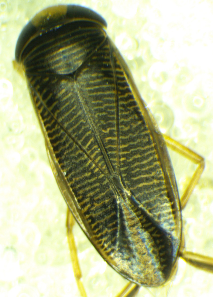 7 to 8 mm. Six pale lines on the pronotum and the pattern of light lines on a dark background extending to the posterior apex of the corium.