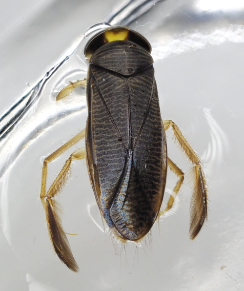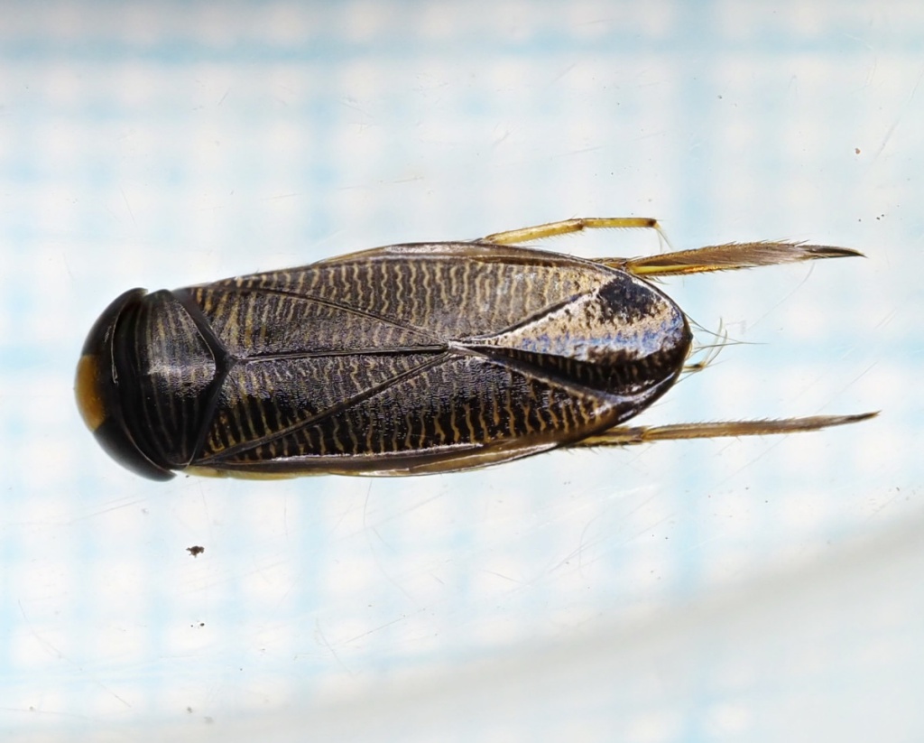 - Hesperocorixa sahlbergi is slightly larger (8mm), the pattern of light lines on a dark background fades to a pale patch near the apex of the corium.