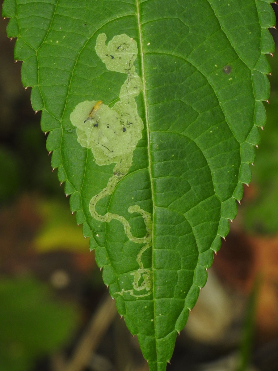 The larvae of the Agromyzid fly Phytoliriomyza melampyga mine the leaves of Impatiens species (Balsams) such as Himalayan Balsam. The early narrow, linear mine later becomes a large irregular whitish blotch with conspicuous frass.