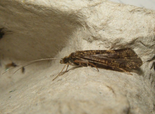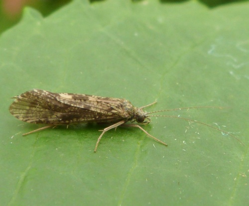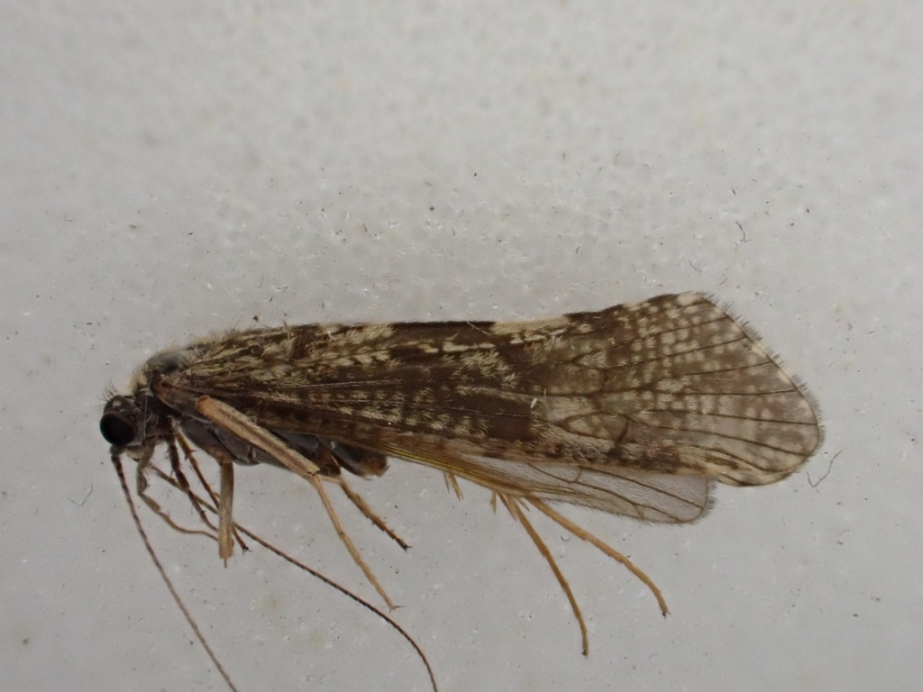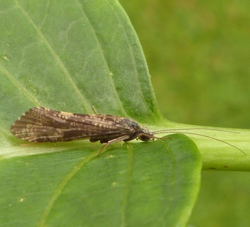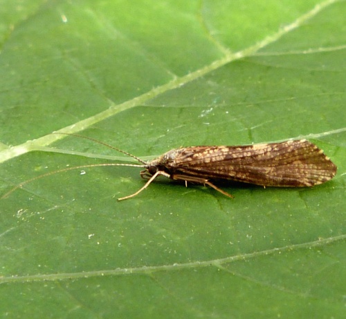 Length 7 to 14 mm. A caddisfly with a mottled wing pattern. The amount of mottling may vary. This species has a large pale blotch on the distal margin of the forewing.