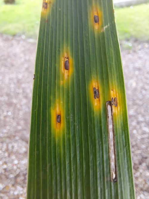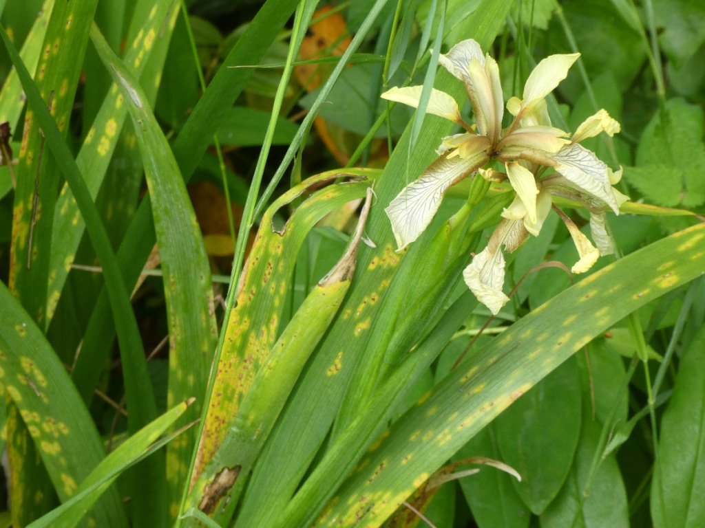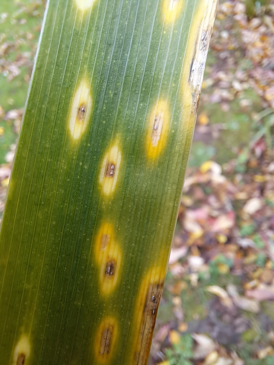 The rust fungus Puccinia iridis affects both surfaces of the leaves of various types of the primary host, Iris, producing brown uredinia and blackish telia. These are not listed as gall-causers in Redfern & Shirley (2023)