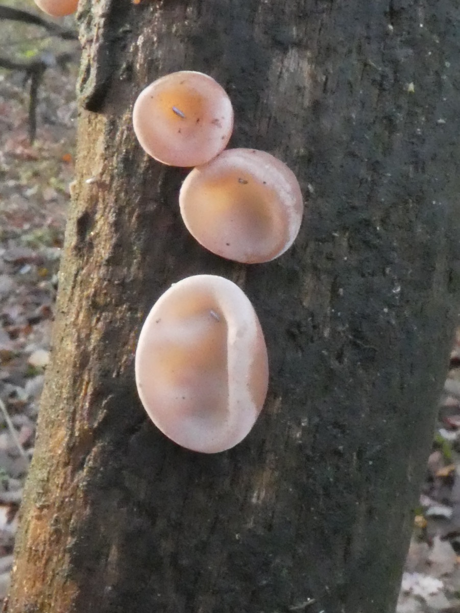 Young cup-shaped specimens may look like a Peziza or related cup fungus, but these have a brittle texture and the fertile surface is upper side.