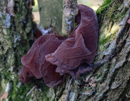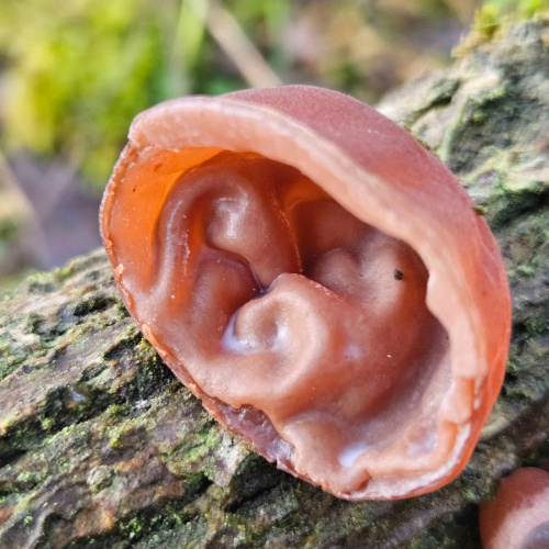Mature fruitbodies are tough, cartilaginous and ear shaped, attached to the substrate by one edge. Very young specimens are cup-shaped. The upper surface is finely downy and the lower (fertile or hymenial) surface is smooth or veined. Typically they are a pinkish-brown or purplish-brown, but may be paler or darker brown, or very rarely may be white. Dry specimens are darker and have a horn-like texture, but regain theri shape when re-wetted.