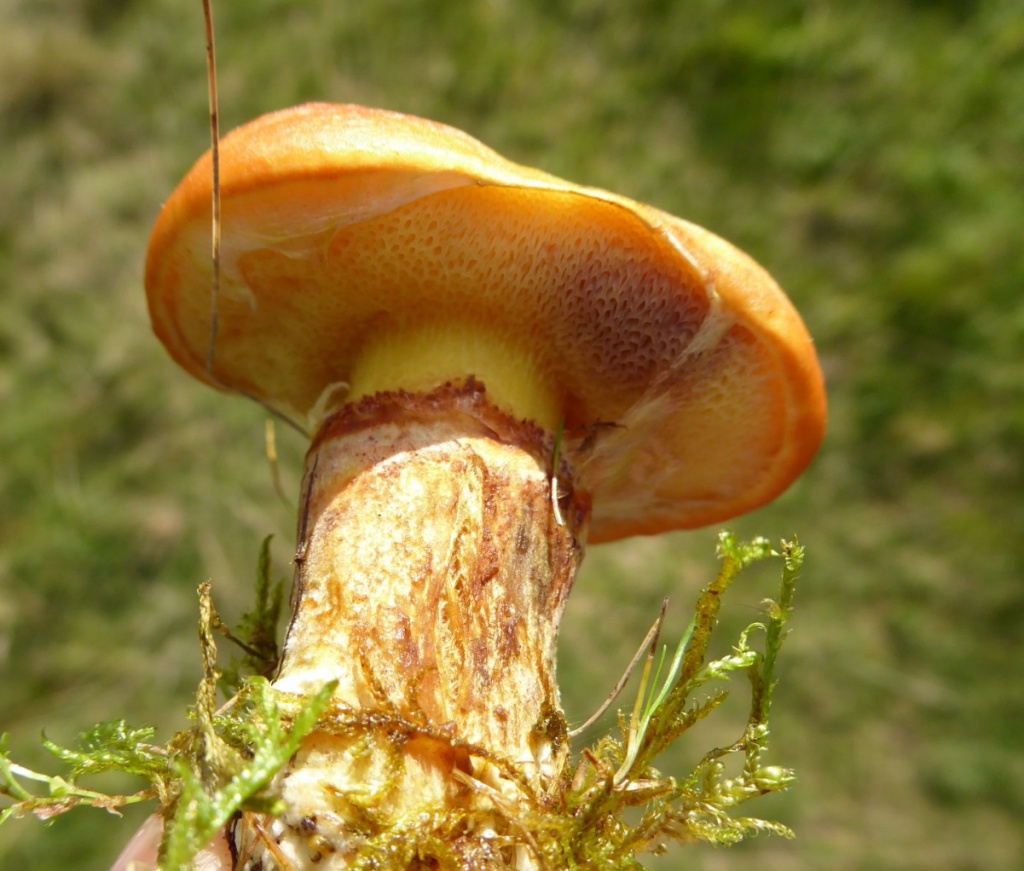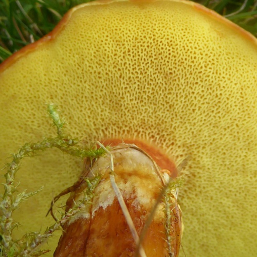 A smallish bolete associated wth Larch. The cap is sticky and variable in colour from pale yellow to orange-yellow. Young specimens have a large floppy ring, covering the yellow pores. The stipe is the same colour as the cap and has a ring zone.