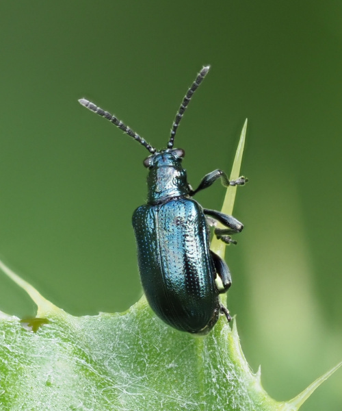 3.5 to 5 mm. This beetle is metallic blue or greenish. The pronotum is constricted in the middle (which separates the genus from Oulema). All tibia have two apical spurs.