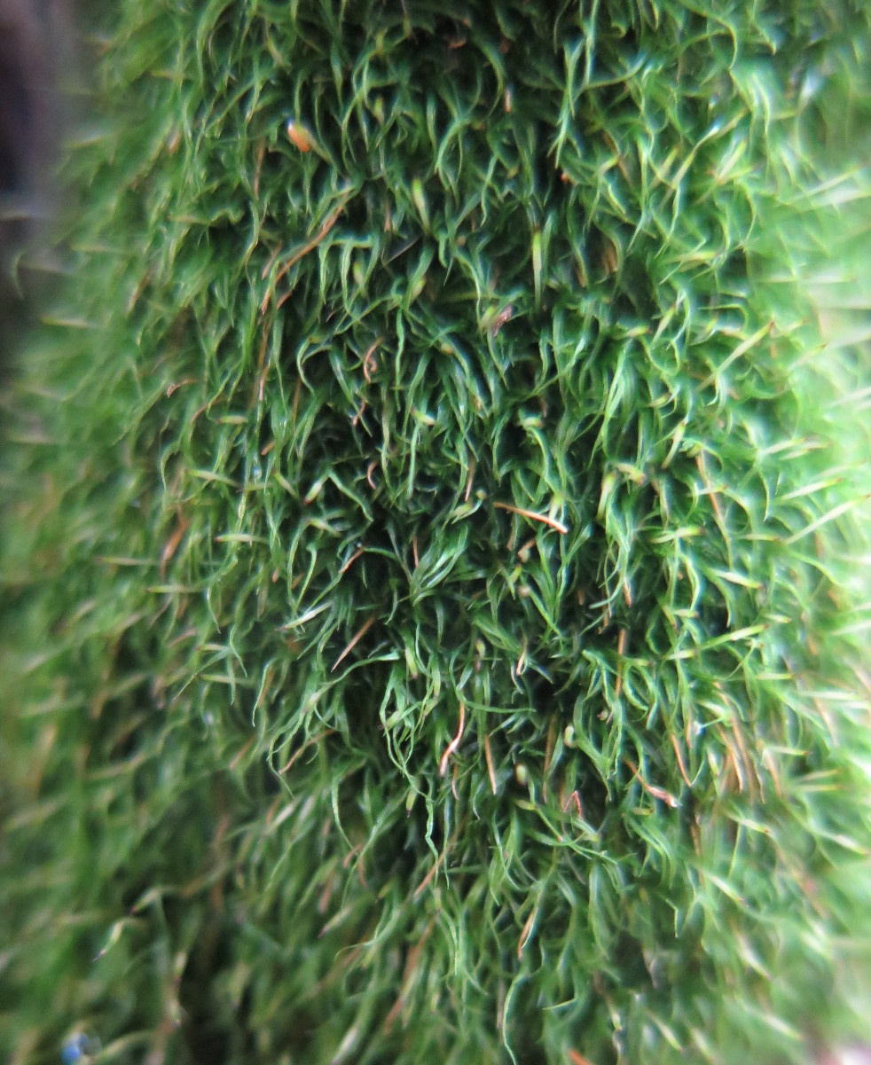 This is the commonest Hypnum on rock and bark in many upland districts of Britain. The leaves vary from 0.75 to about 1.75 mm in length, are strongly curved towards the underside of the shoot, and gradually taper to a fine point. Shoots are irregularly branched, and yellow-green to dull green, without any trace of the warm, golden brown tints sometimes found in H. cupressiforme and which are often conspicuous in H. lacunosum. The shoots can be medium-sized (up to about 1.5 mm wide), but are frequently slender, especially when growing on steep surfaces. The shortly pointed capsule lid is the most reliable feature for distinguishing this from similar species of Hypnum, but when capsules are absent or the lids have fallen, microscopic examination may be necessary to confirm identification. Capsule lids may look more pointed when dry than when moist. The capsules are 2.5 to 3 mm long.