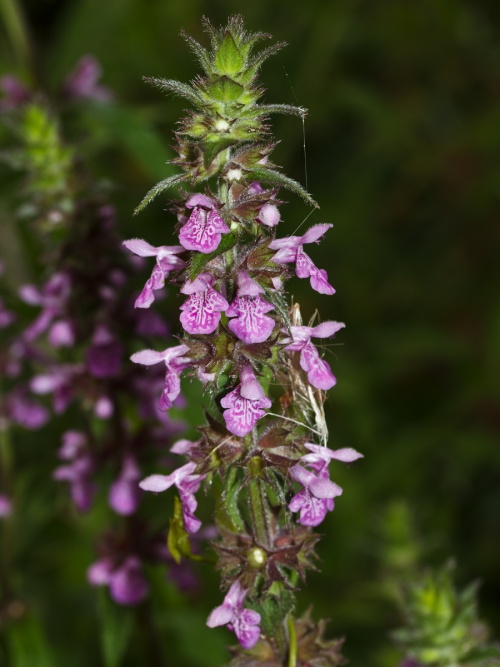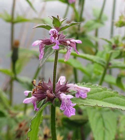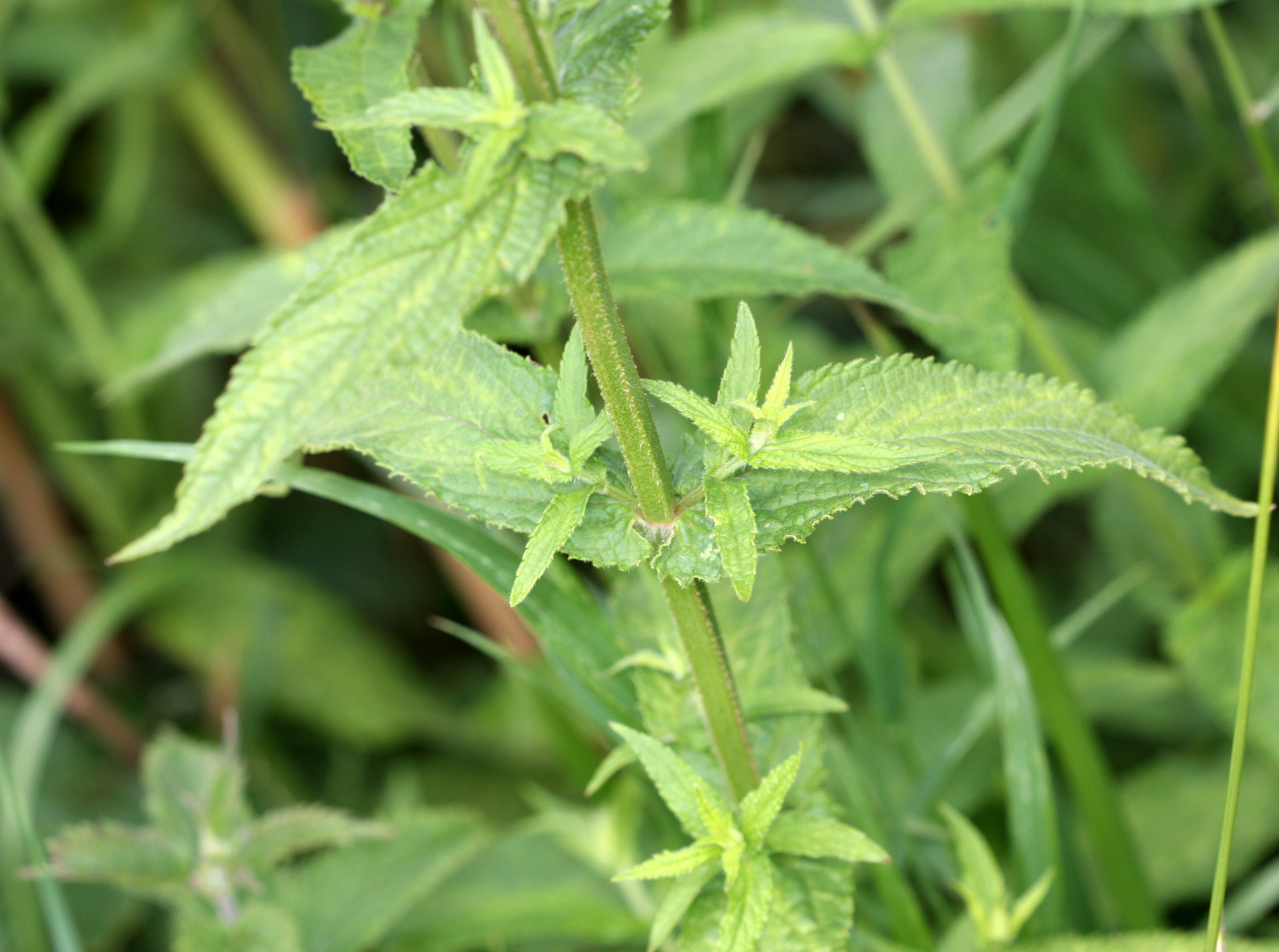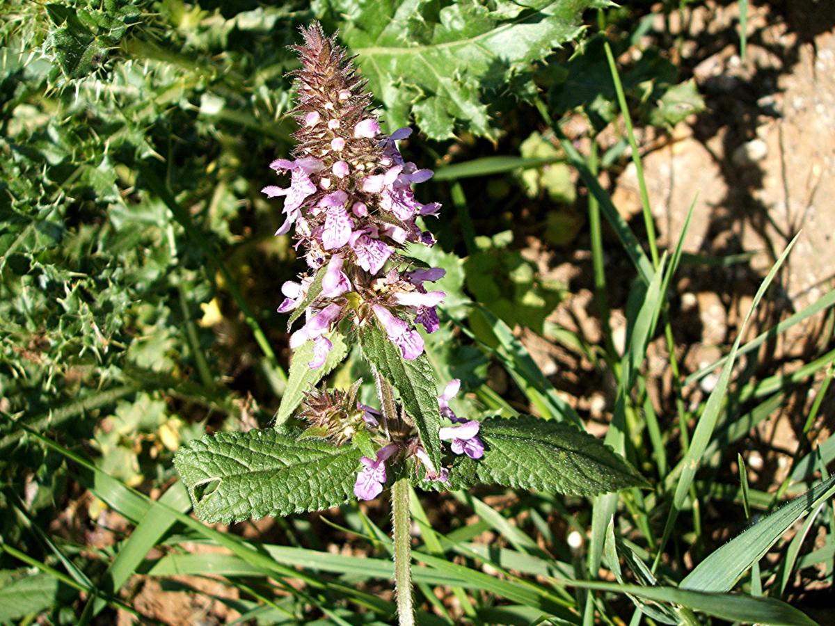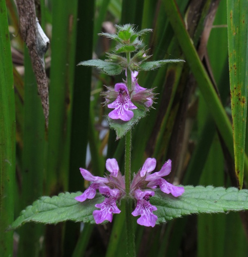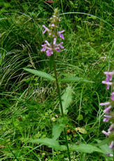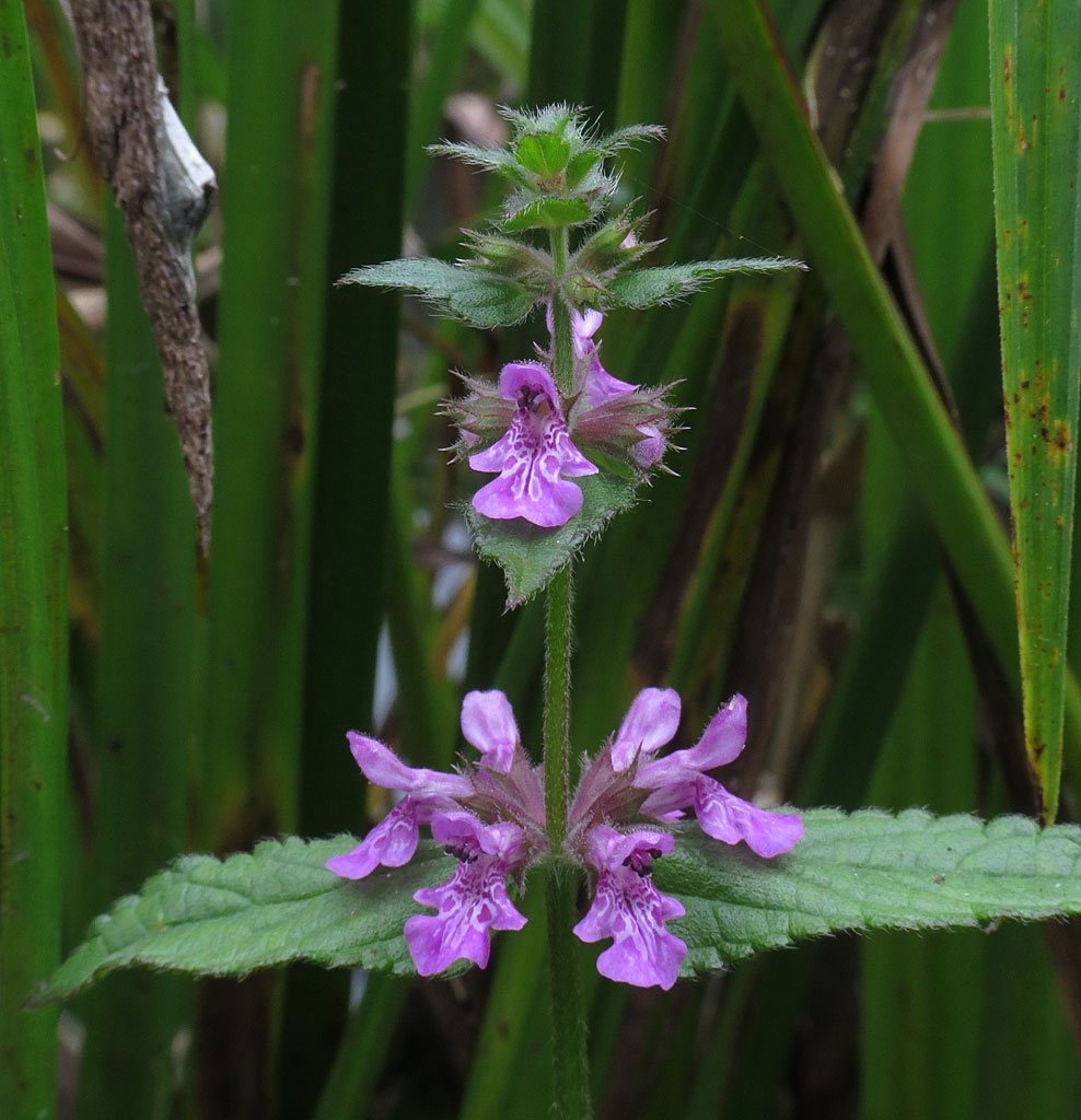 Medium to tall, hairy, faintly aromatic plant to 2 metres, stems erect. Leaves oblong to lanceolate with a heart shaped base, blunt toothed, only the lower stalked, the upper unstalked. Flowers purple, 12 to 15 mm long, the whorls forming a dense spike interrupted below.