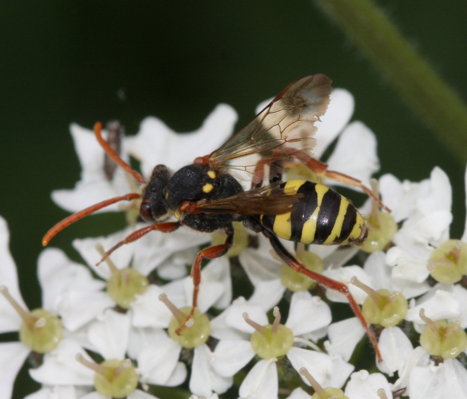 Length 7-10mm. A small cuckoo bee with just yellow and black stripes and no red markings, the spots on tergite 2 clearly separated. The female has two yellow tubercles on the thorax which are absent in males. Male lower face yellow. Female antennae all orange, males have partially black antennae.