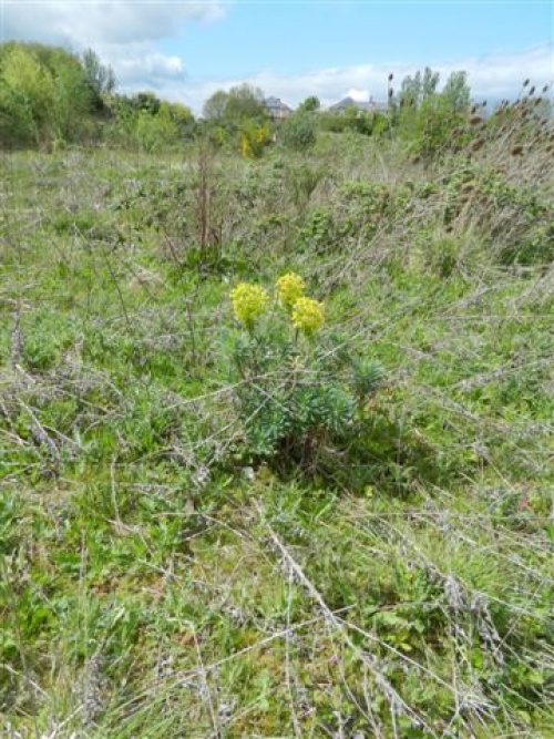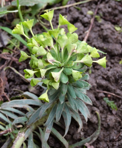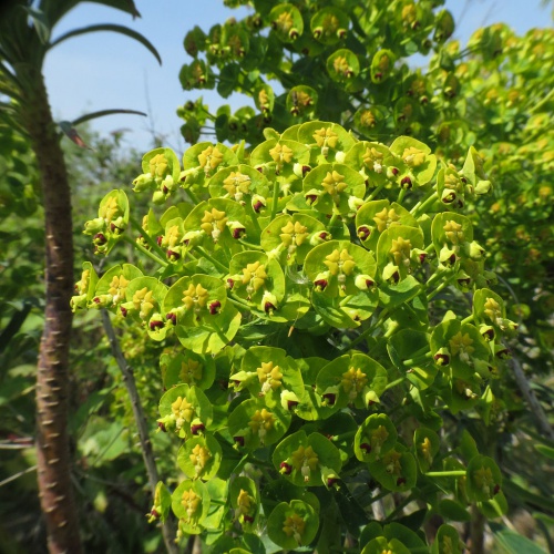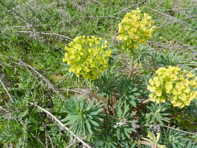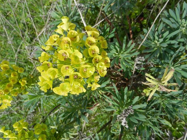 Euphorbia characias is an erect, sparsely-branched medium-sized sub-shrub up to 120 cm tall with oblong, glaucous grey-green leaves and large, rounded heads of greenish-yellow flowers. There are two main subspecies escaping and naturalising in Britain .In subsp. veneta the glands (the crescent-shaped cyathia) are green at first, turning yellow, then, orangey and the horns are long. [In subsp. characias they are dark beetroot red and the horns are short].