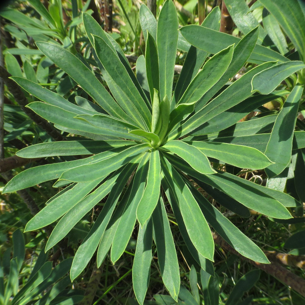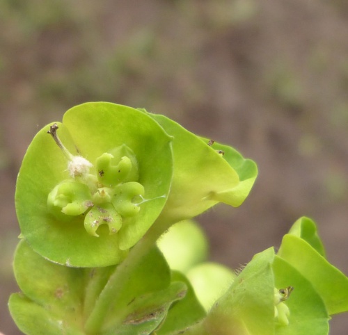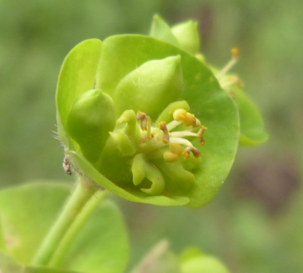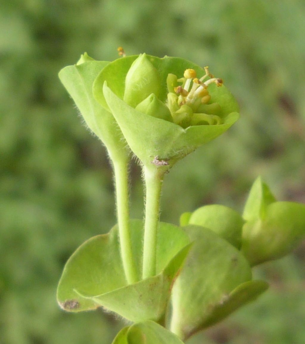 A very tall plant when full-grown; stems hairy; capsules densely hairy. Glands on the cyathium (the cup shaped structure that bears the male and female flowers) are concave on the outer edge, with two points