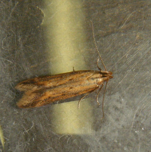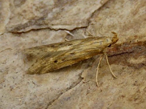 Wingspan 14 to19 mm. Orangey-brown wing has a row of dark dots and a pale fringe.