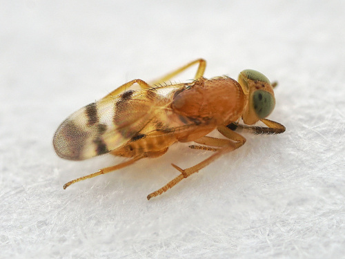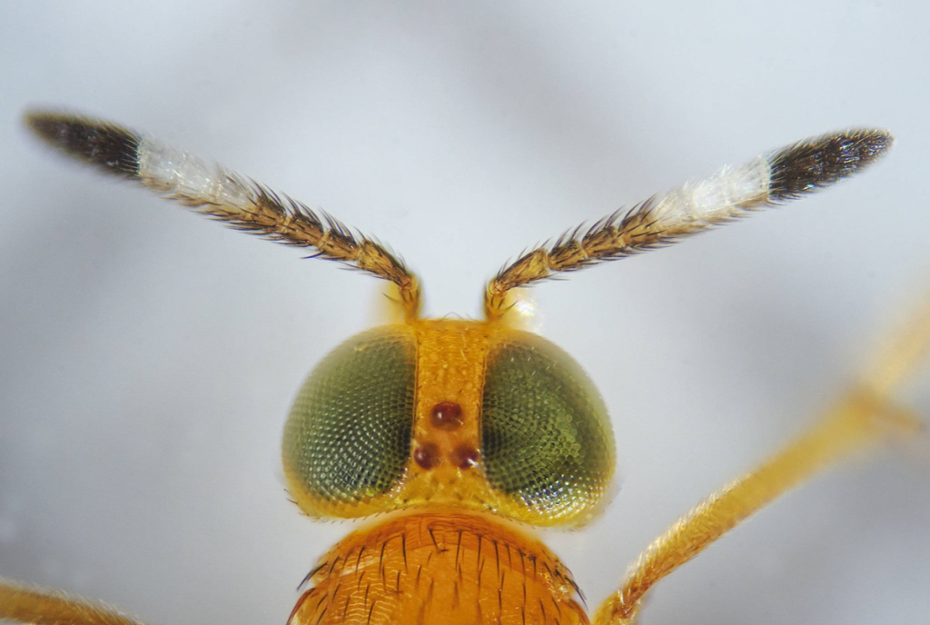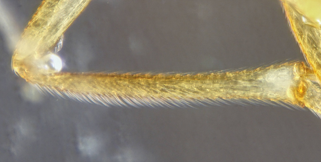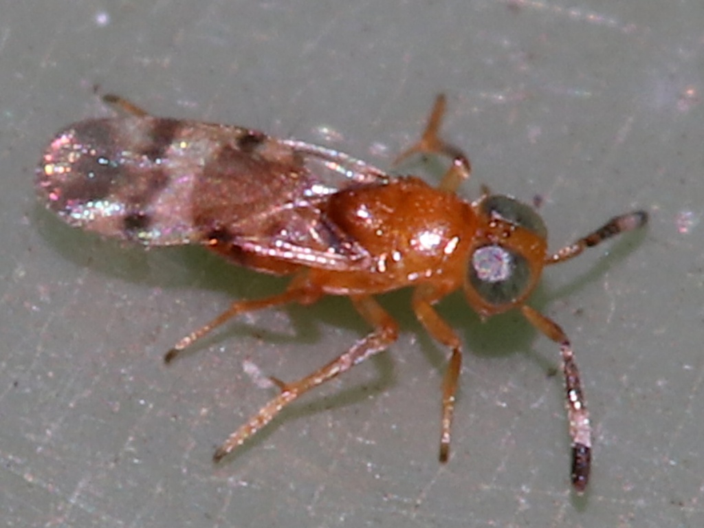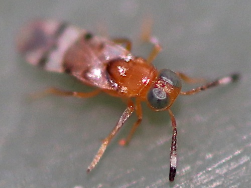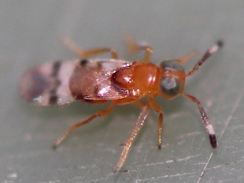 The tiny (~2mm) encyrtid wasp Microterys seyon is very distinctive in appearance, being orange-brown in general appearance with strongly patterned wings and with antennae that are black and white at the tips. Lateral view of the antennae: F4-6 white on top but darker underneath (c.f. M. tricoloricornis F4-6 white all round). Despite its striking appearance there are similar species and great care is needed with identification.