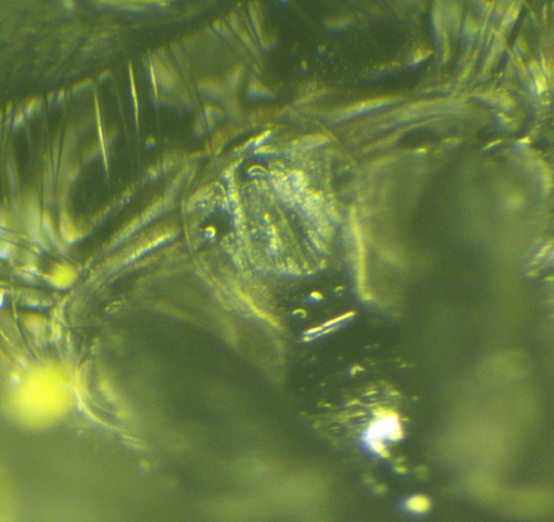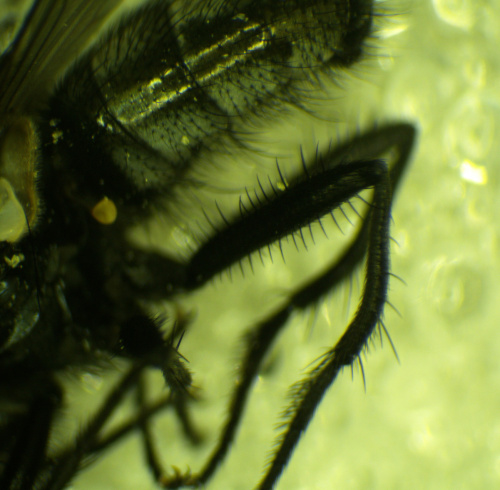 There are three UK Morellia species that all look very similar. M. simplex has bristles on the edge of the prosternum (lacking in the other two species). M. hortorum has a conspicuous row of anteroventrals on the hind tibia.