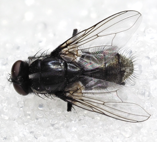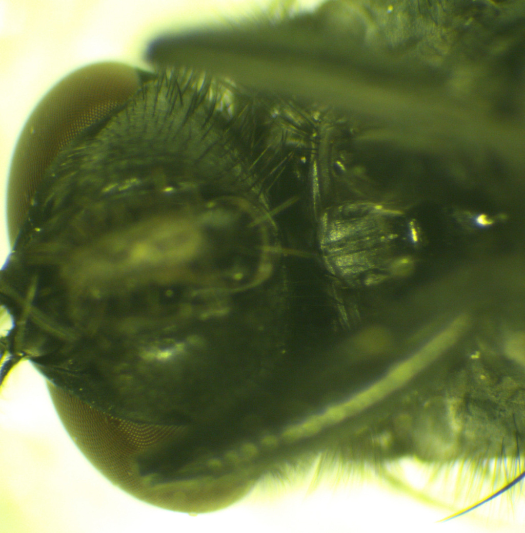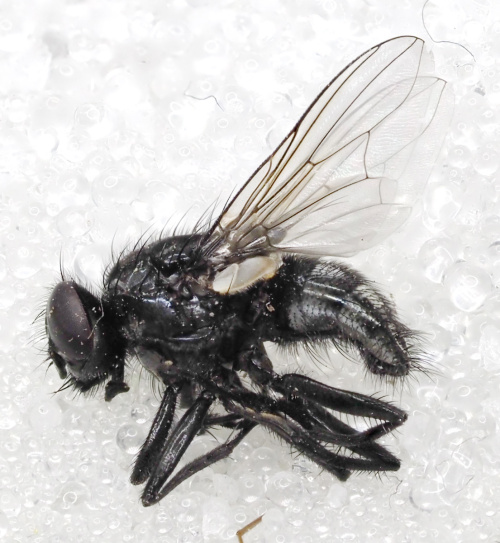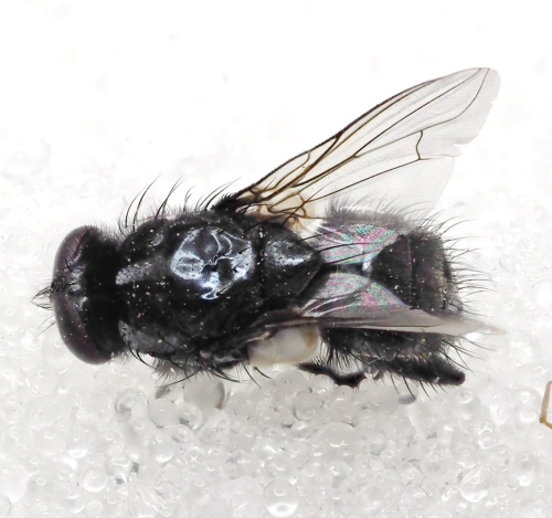 A relatively small muscid (5-7.5mm), largely black but with a pale central stripe on the thorax. See ID Guidance below.