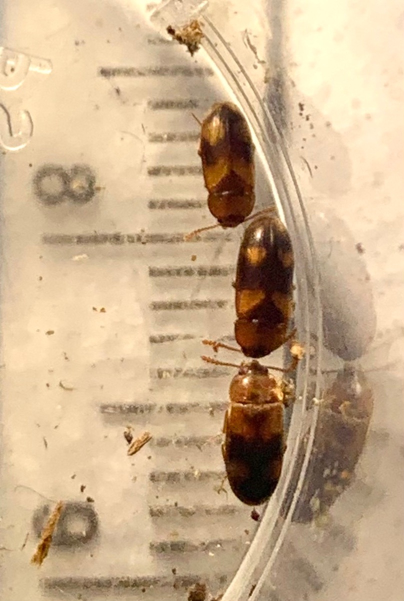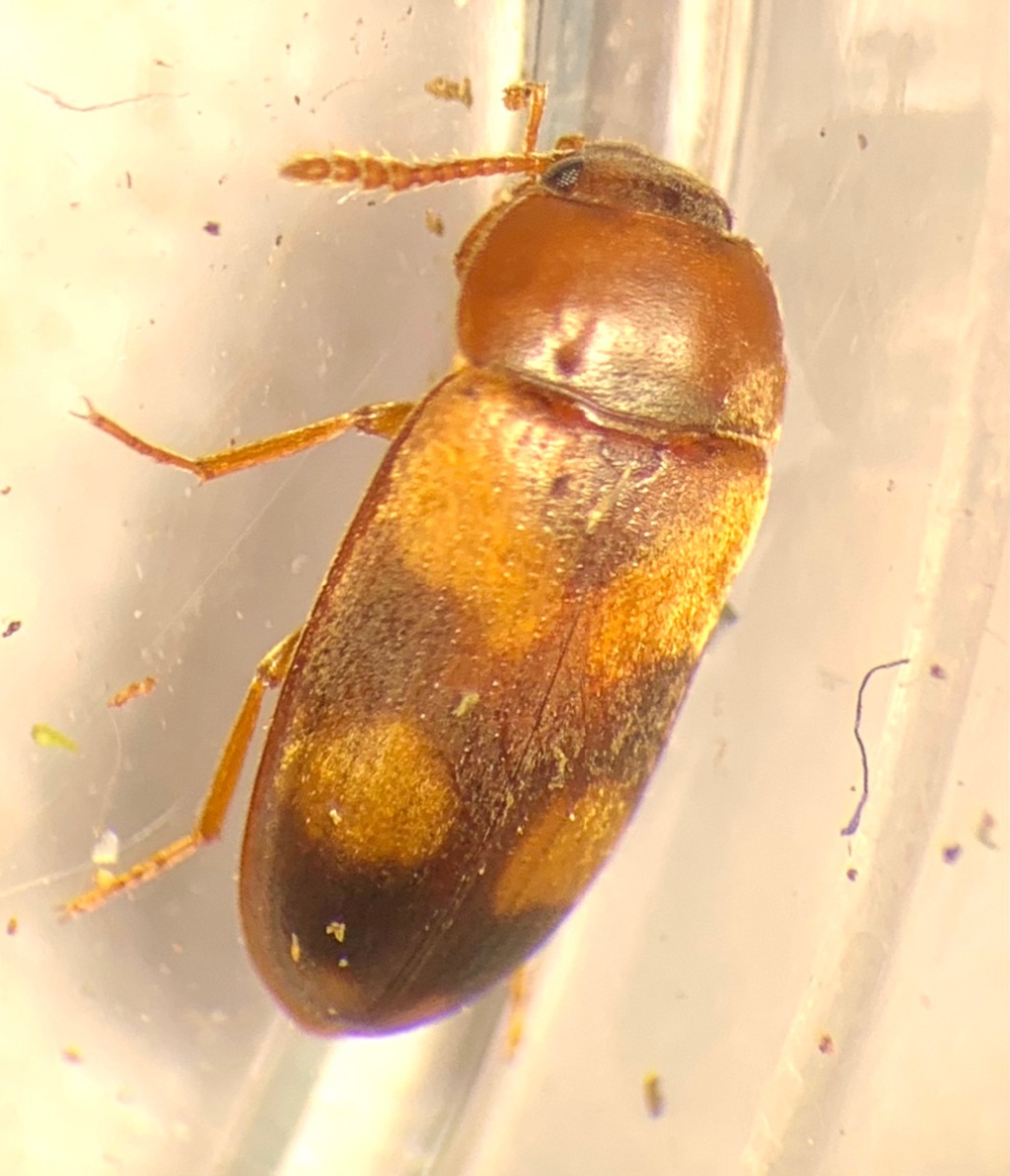 4.0 to 4.5 mm. Distinguished from other members of the genus by the dense and very fine dorsal punctures and pubescence, and the form of the terminal segment of the maxillary palp which is distinctly broader than the penultimate segment. The shape is long-oval with the head much narrower than the pronotum and the pronotum and elytra separately rounded, colour variable but usually pale orange-brown, usually with the head a little darker than the elytra, and with two broad transverse paler bands to each elytron; one across the basal quarter and across the apical third although they vary in size and intensity.