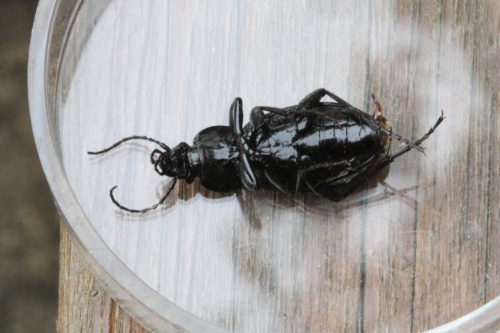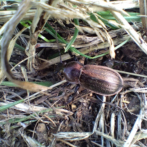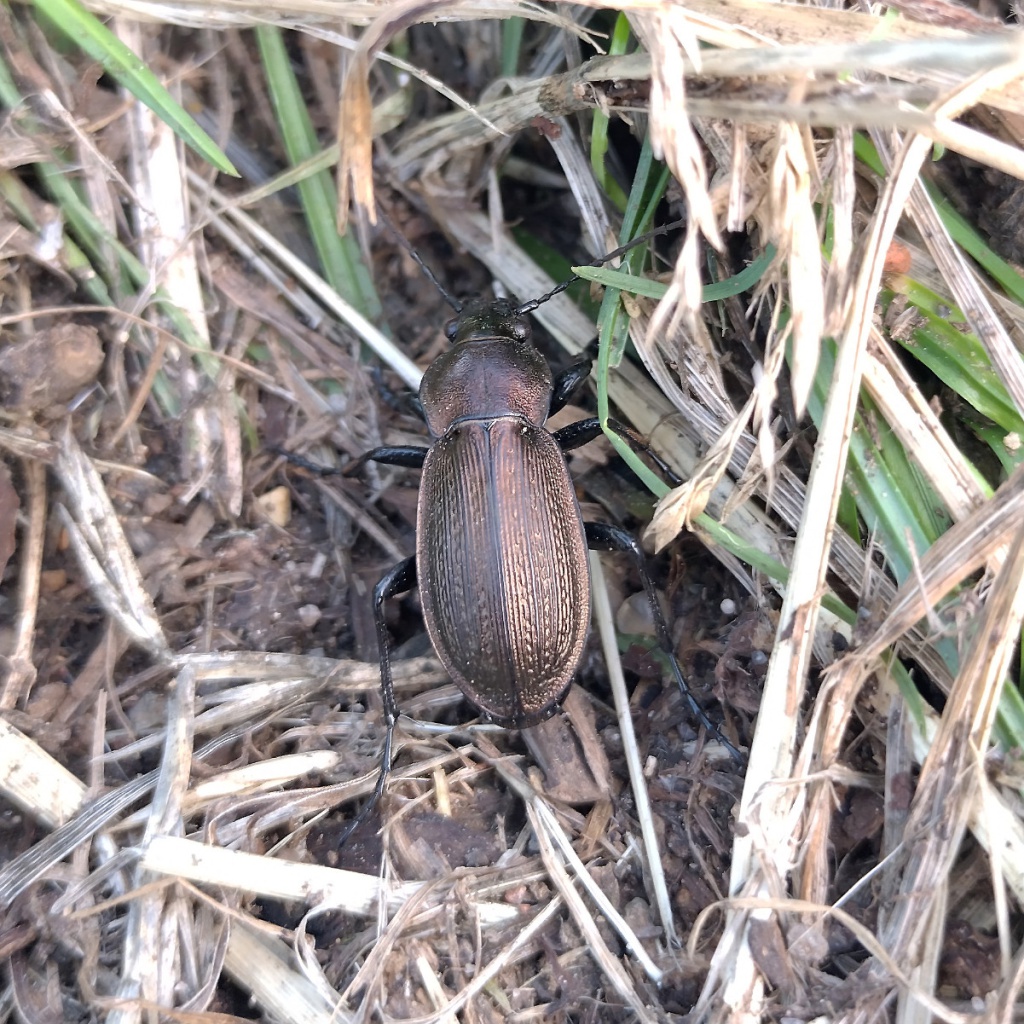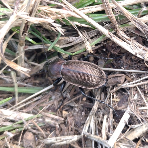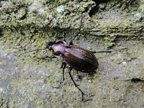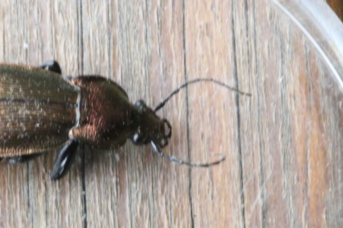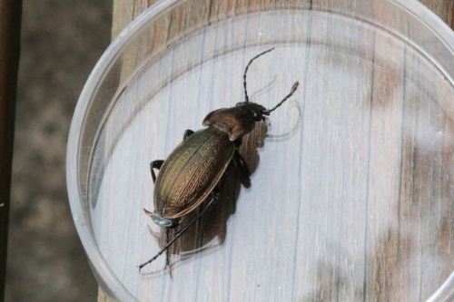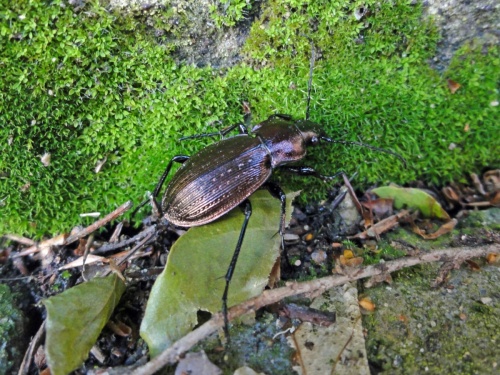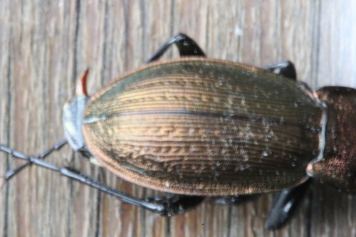 A large beetle (22 to 26mm). Body entirely metallic green or coppery. The elytral sculpture is suggestive of strings of beads, and this gives rise to the common name of Necklace Ground Beetle.