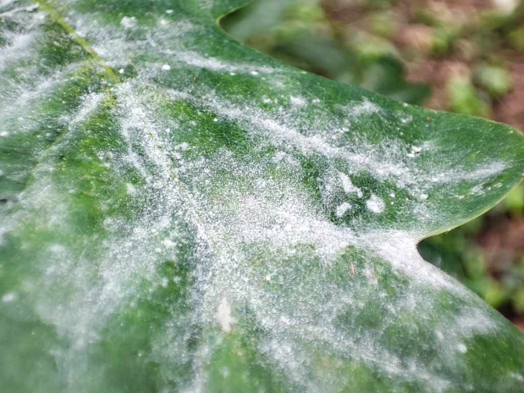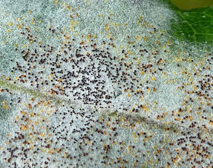 Erysiphe alphitoides produces a dense and very conspcuous white mycelium on both sides of oak leaves (amphipyllous), often deforming the leaf. The chasmothecia containing the ascospores have characteristic densely branched tips to the appendages.