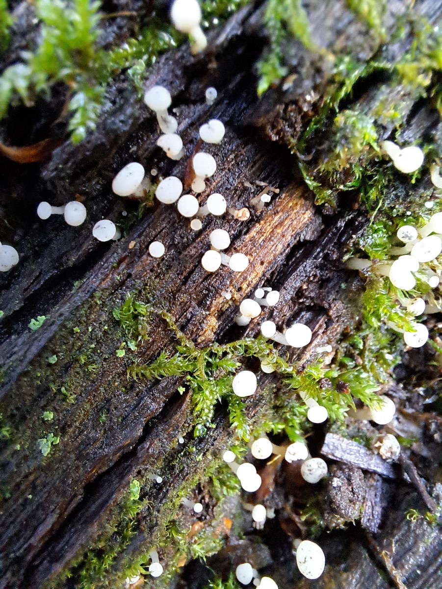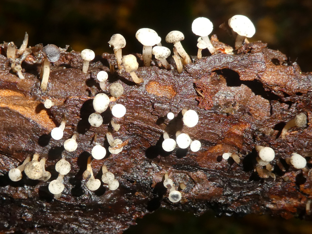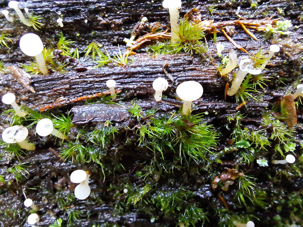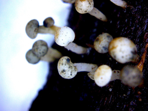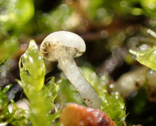 A small long-stemmed slightly downy white fungus with a convex hymenium (fertile surface) and thick stalk, usuallly in clusters on mossy oak stumps. With age it becomes brownish and spotted with black